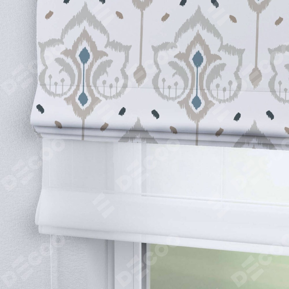 Римская штора день-ночь производителя «Cortin», используется для проёма, пошита из двух полотен, с лицевой блэкаут с нанесением сублимационной печати «Икат узор», вторая ткань тюль (по стандарту комплектуется тюль белого цвета артикул V-01). Имеет универсальный механизм и подходит для монтажа: на потолок, на стену и в нишу.