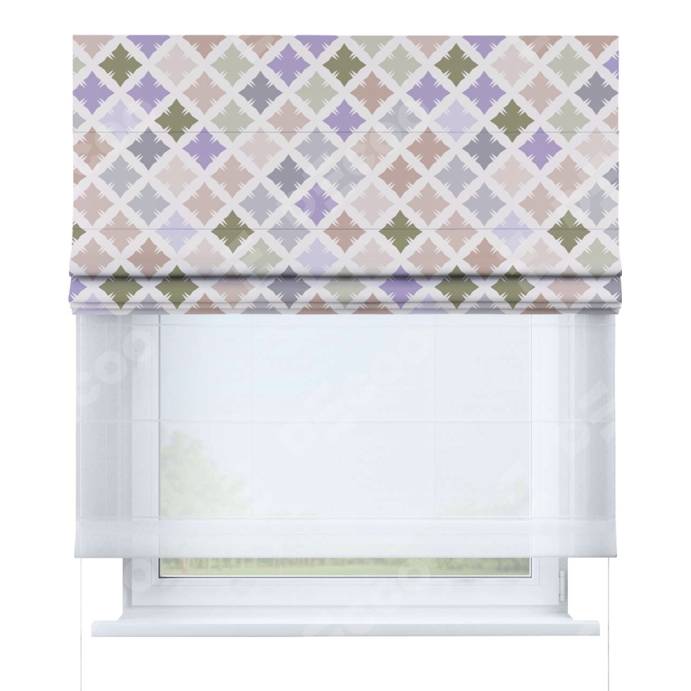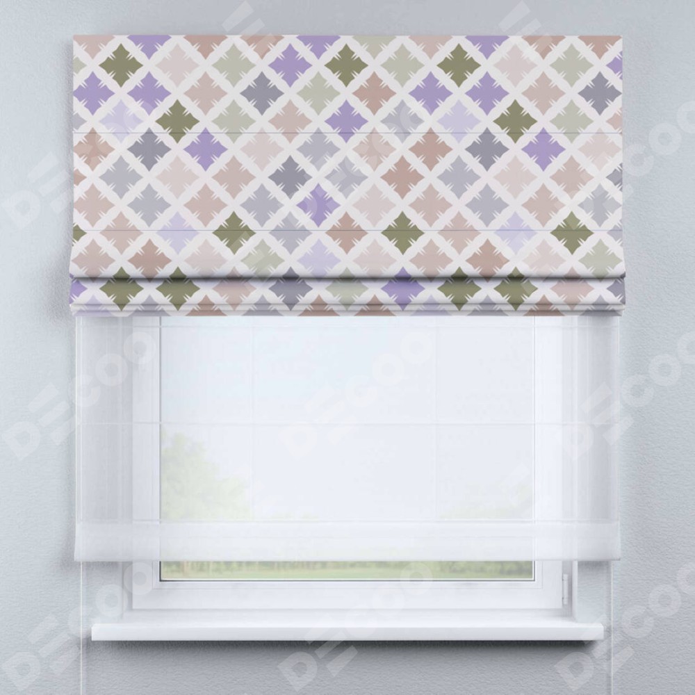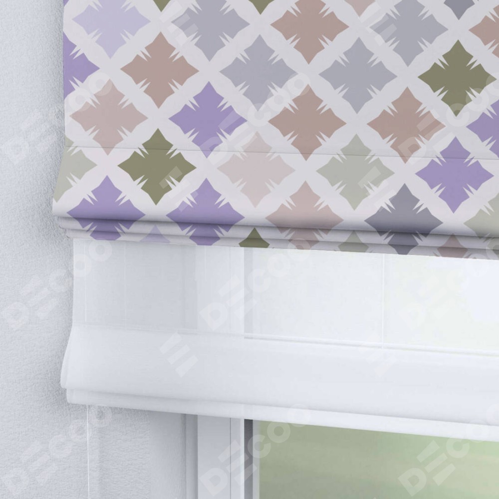Римская штора день-ночь производителя «Cortin», используется для проёма, пошита из двух полотен, с лицевой блэкаут с нанесением сублимационной печати «Фигурные плитки», вторая ткань тюль (по стандарту комплектуется тюль белого цвета артикул V-01). Имеет универсальный механизм и подходит для монтажа: на потолок, на стену и в нишу.