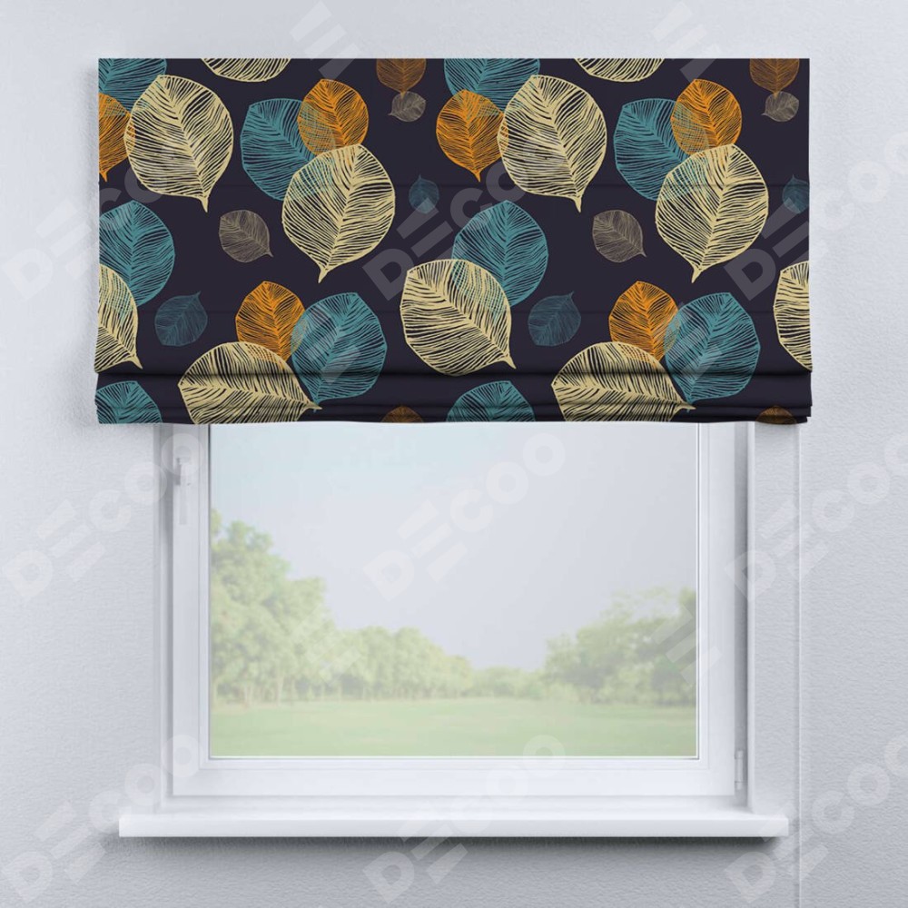 Римская штора производителя «Cortin», используется для проёма, пошита из ткани блэкаут с нанесением сублимационной печати «Листья в ночи». Имеет универсальный механизм и подходит для монтажа: на потолок, на стену и в нишу.