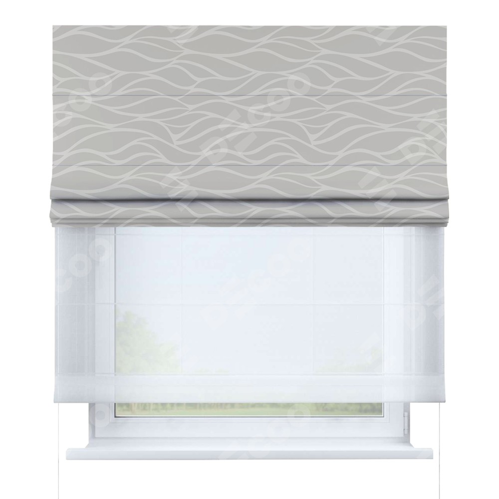 Римская штора день-ночь производителя «Cortin», используется для проёма, пошита из двух полотен, с лицевой блэкаут с нанесением сублимационной печати «Саванна песочный», вторая ткань тюль (по стандарту комплектуется тюль белого цвета артикул V-01). Имеет универсальный механизм и подходит для монтажа: на потолок, на стену и в нишу.