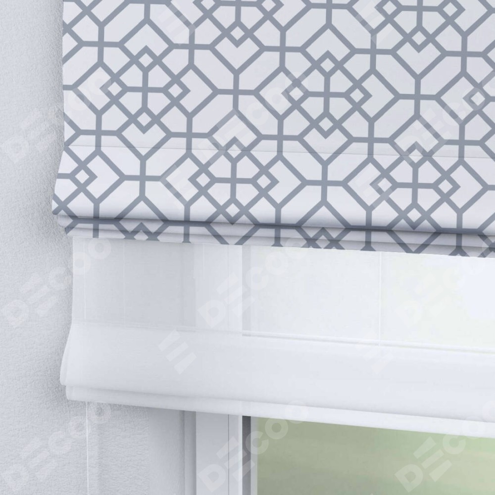 Римская штора день-ночь производителя «Cortin», используется для проёма, пошита из двух полотен, с лицевой блэкаут с нанесением сублимационной печати «Архитектурный орнамент», вторая ткань тюль (по стандарту комплектуется тюль белого цвета артикул V-01). Имеет универсальный механизм и подходит для монтажа: на потолок, на стену и в нишу.