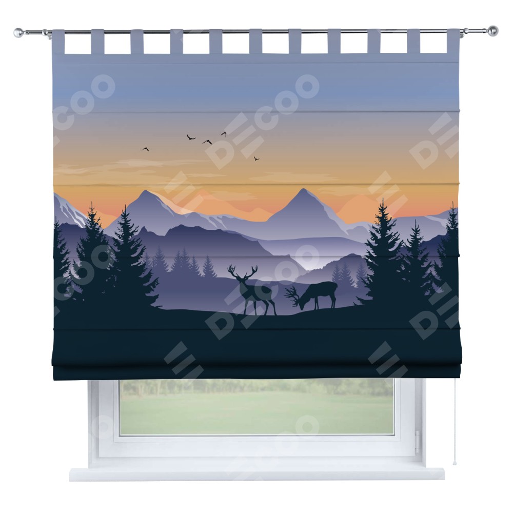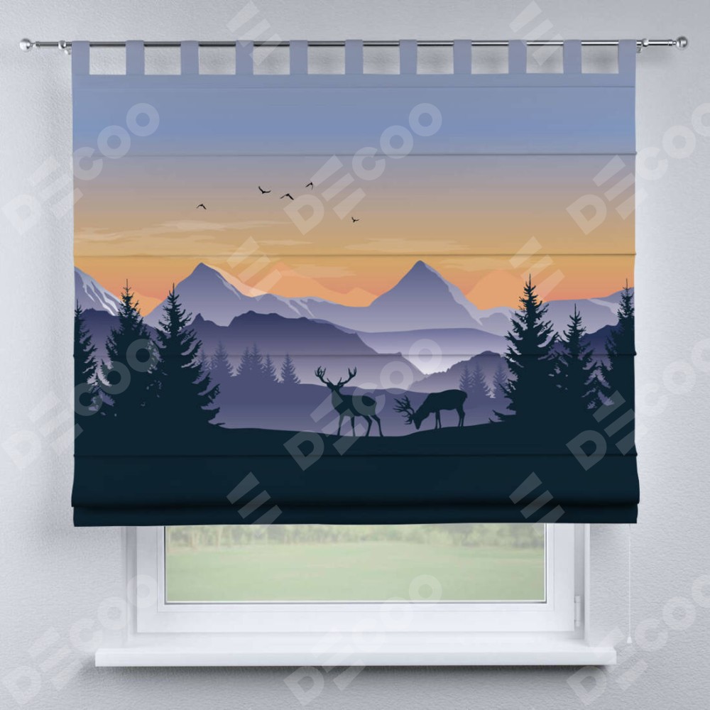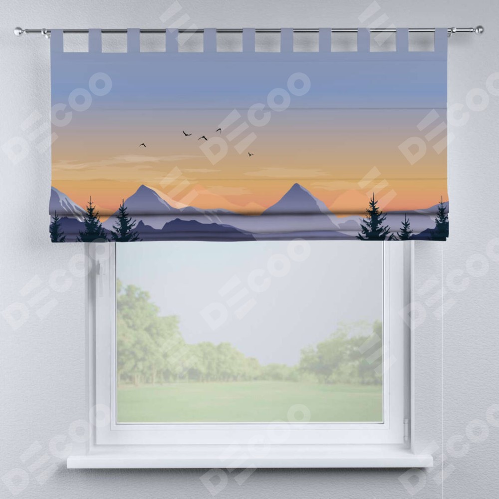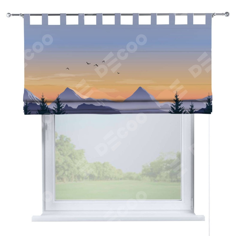Римская штора производителя «Cortin», используется для проёма, пошита из ткани блэкаут с нанесением сублимационной печати «Закат в горах». Данная модель пошита на петлях, комплектуется на выбор круглым карнизом и подходит для монтажа на стену. Римская штора на петлях имеет простую систему регулировки высоты, отличительным преимуществом данной модели является простой способ монтажа. Достаточно повесить ее на трубу и штора готова!