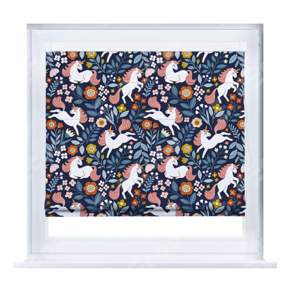 Римская штора производителя «Cortin», устанавливается на створку окна, пошита из ткани блэкаут с нанесением сублимационной печати «Цветы и единороги». Штора шьётся по индивидуальным размерам, для данного типа римской шторы возможная ширина от 35 до 150 см., высота до 250 см.
