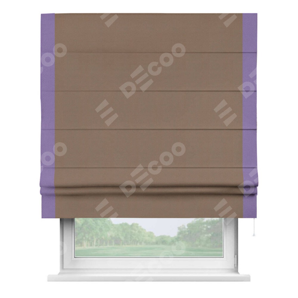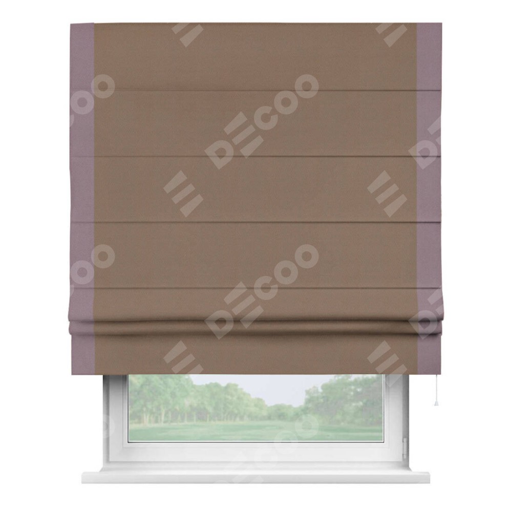 Римская штора производителя «Cortin», используется для проёма, пошита из ткани блэкаут однотонный коричневый, артикул ткани 88285. Отделка шторы кантом «Стрим Дуо», ткань для канта используется из блэкаута однотонного разной расцветки на выбор. Имеет универсальный механизм и подходит для монтажа: на потолок, на стену и в нишу.