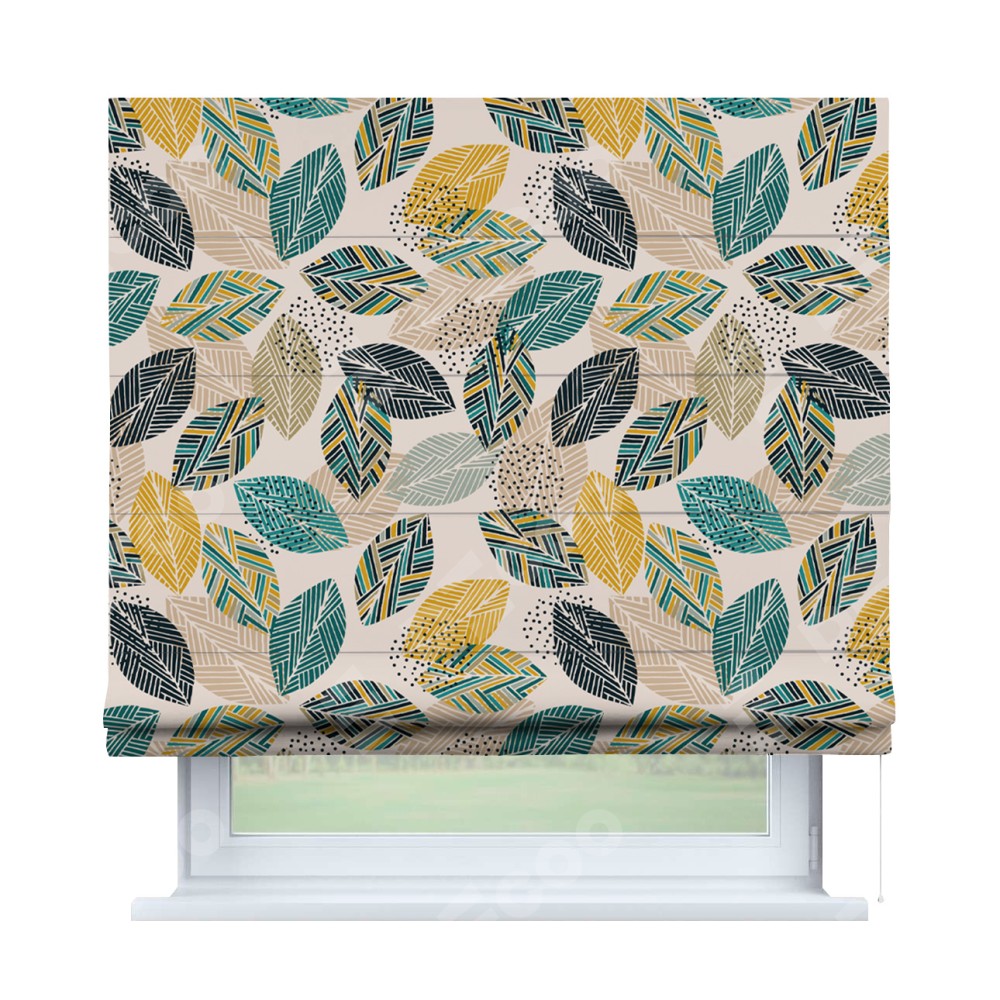 Римская штора производителя «Cortin», используется для проёма, пошита из ткани блэкаут с нанесением сублимационной печати «Листья с орнаментом». Имеет универсальный механизм и подходит для монтажа: на потолок, на стену и в нишу.
