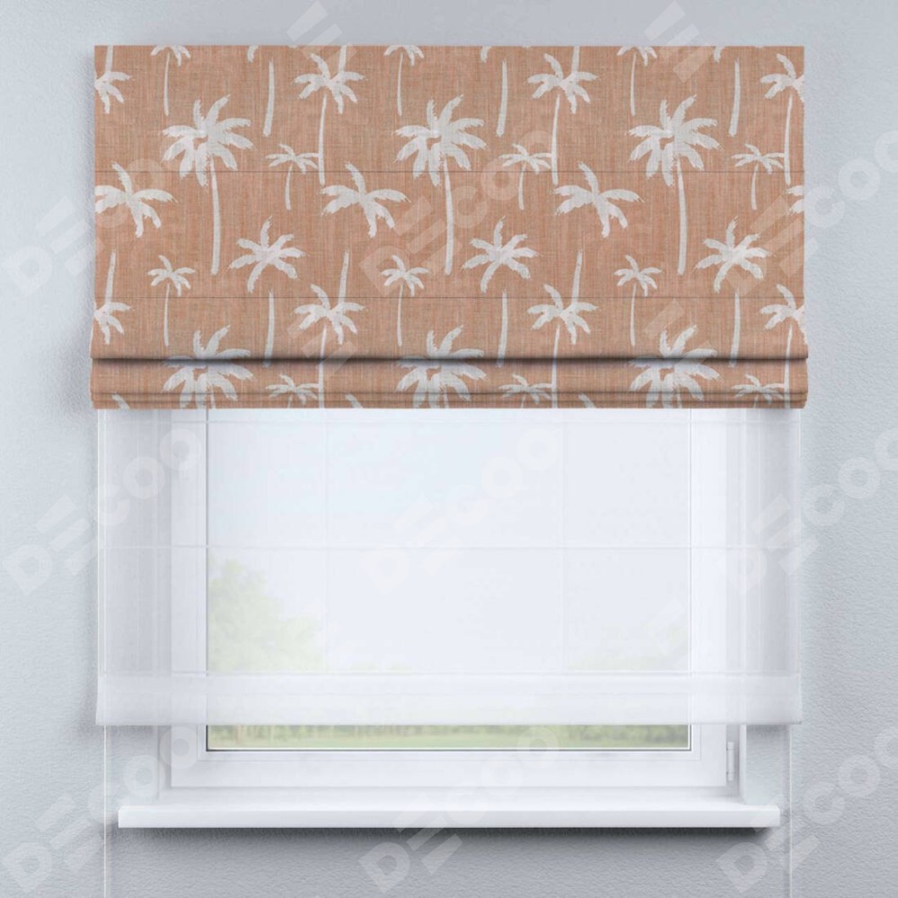 Римская штора день-ночь производителя «Cortin», используется для проёма, пошита из двух полотен, с лицевой блэкаут с нанесением сублимационной печати «Пальмы на закате», вторая ткань тюль (по стандарту комплектуется тюль белого цвета артикул V-01). Имеет универсальный механизм и подходит для монтажа: на потолок, на стену и в нишу.