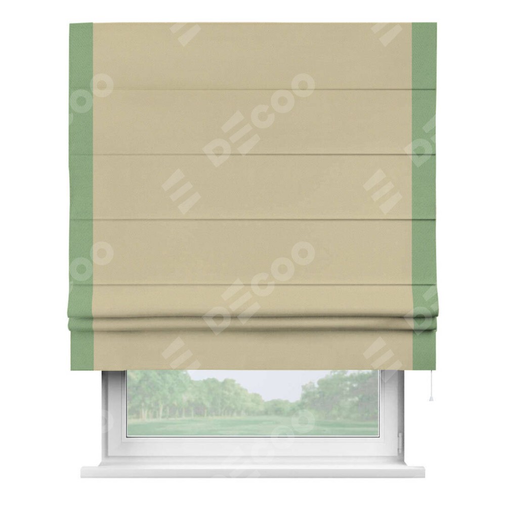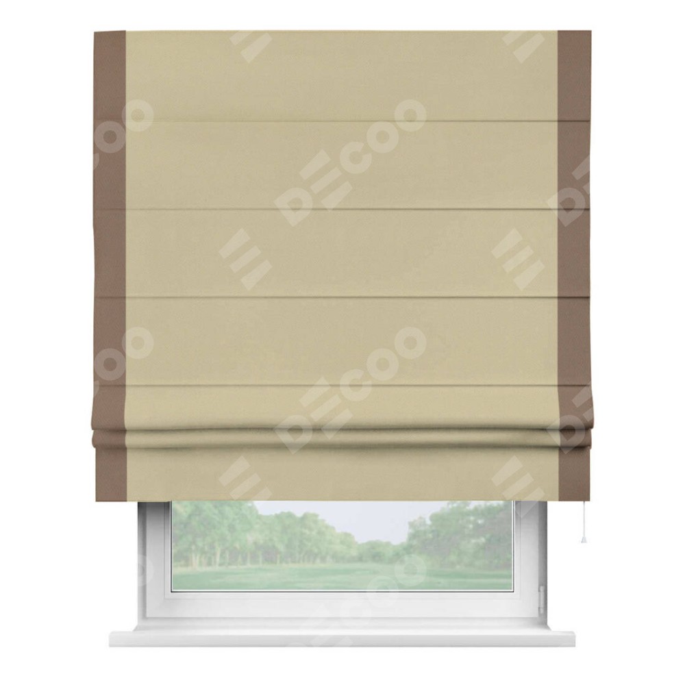 Римская штора производителя «Cortin», используется для проёма, пошита из ткани блэкаут однотонный кофейный, артикул ткани 13130. Отделка шторы кантом «Стрим Дуо», ткань для канта используется из блэкаута однотонного разной расцветки на выбор. Имеет универсальный механизм и подходит для монтажа: на потолок, на стену и в нишу.