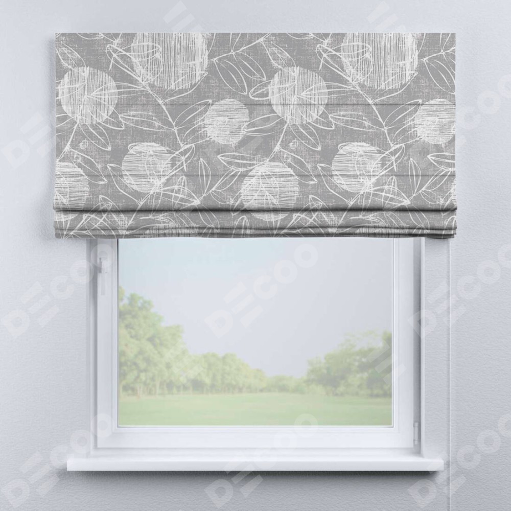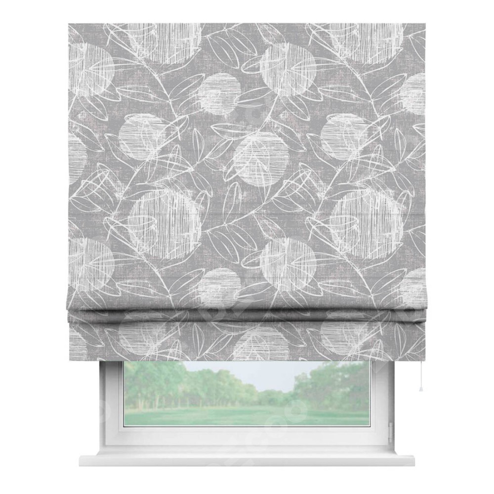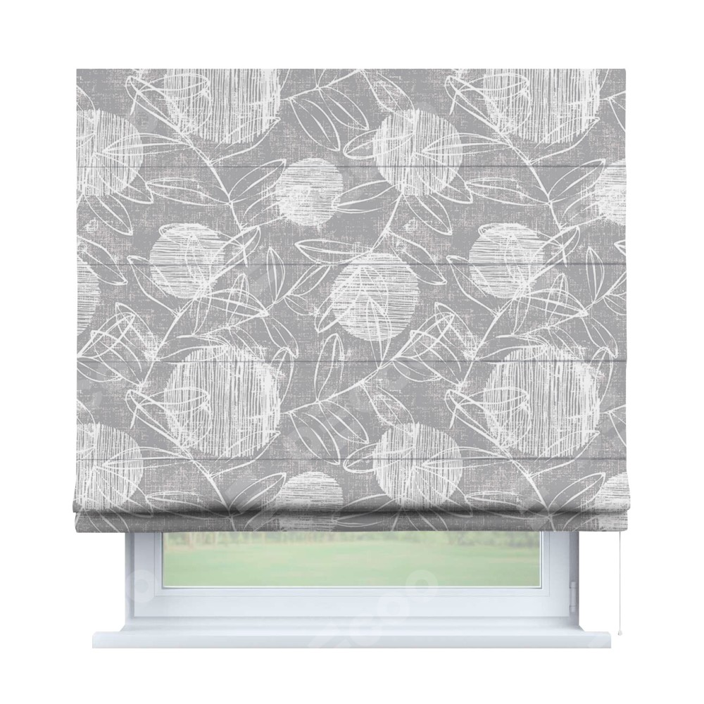 Римская штора производителя «Cortin», используется для проёма, пошита из ткани блэкаут с нанесением сублимационной печати «Серо-белая фантазия». Имеет универсальный механизм и подходит для монтажа: на потолок, на стену и в нишу.