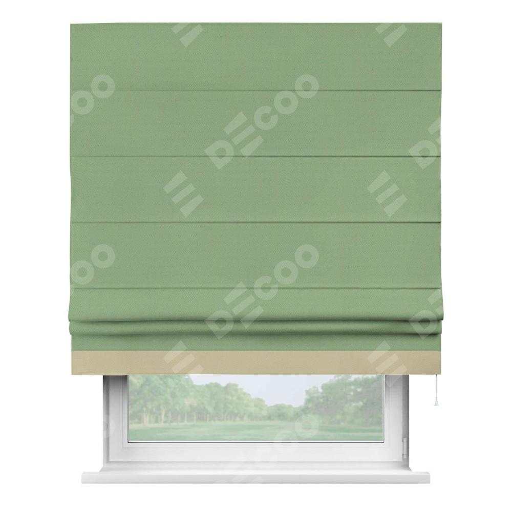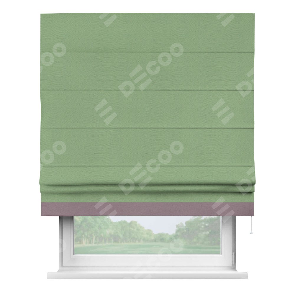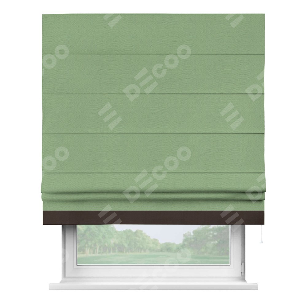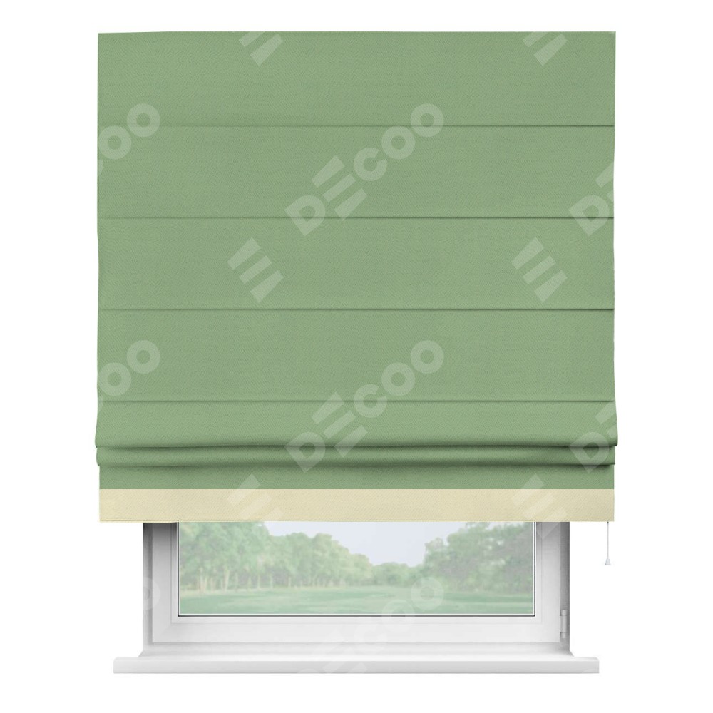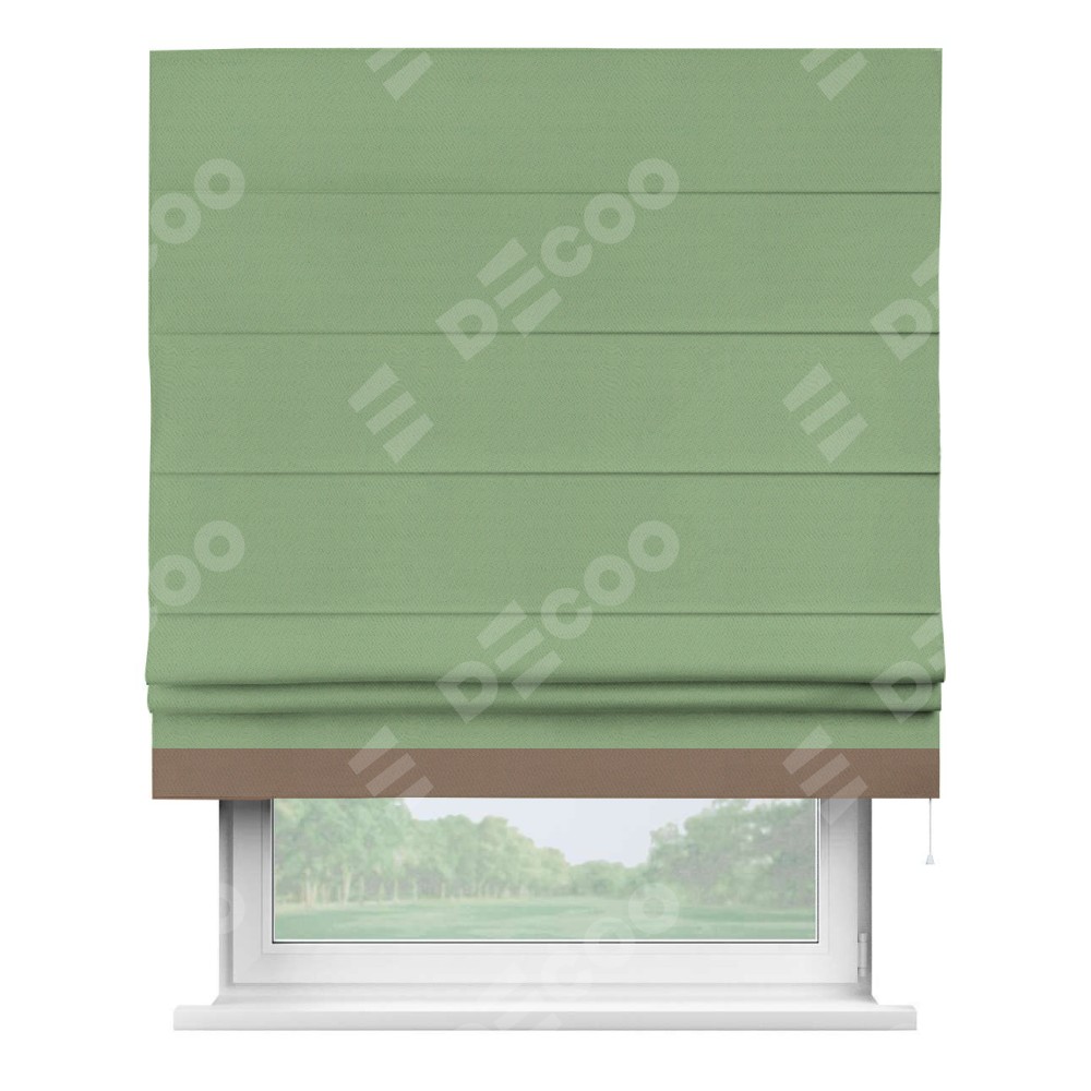 Римская штора производителя «Cortin», используется для проёма, пошита из ткани блэкаут однотонный оливковый, артикул ткани 88300. Отделка шторы кантом «Джестер», ткань для канта используется из блэкаута однотонного разной расцветки на выбор. Имеет универсальный механизм и подходит для монтажа: на потолок, на стену и в нишу.