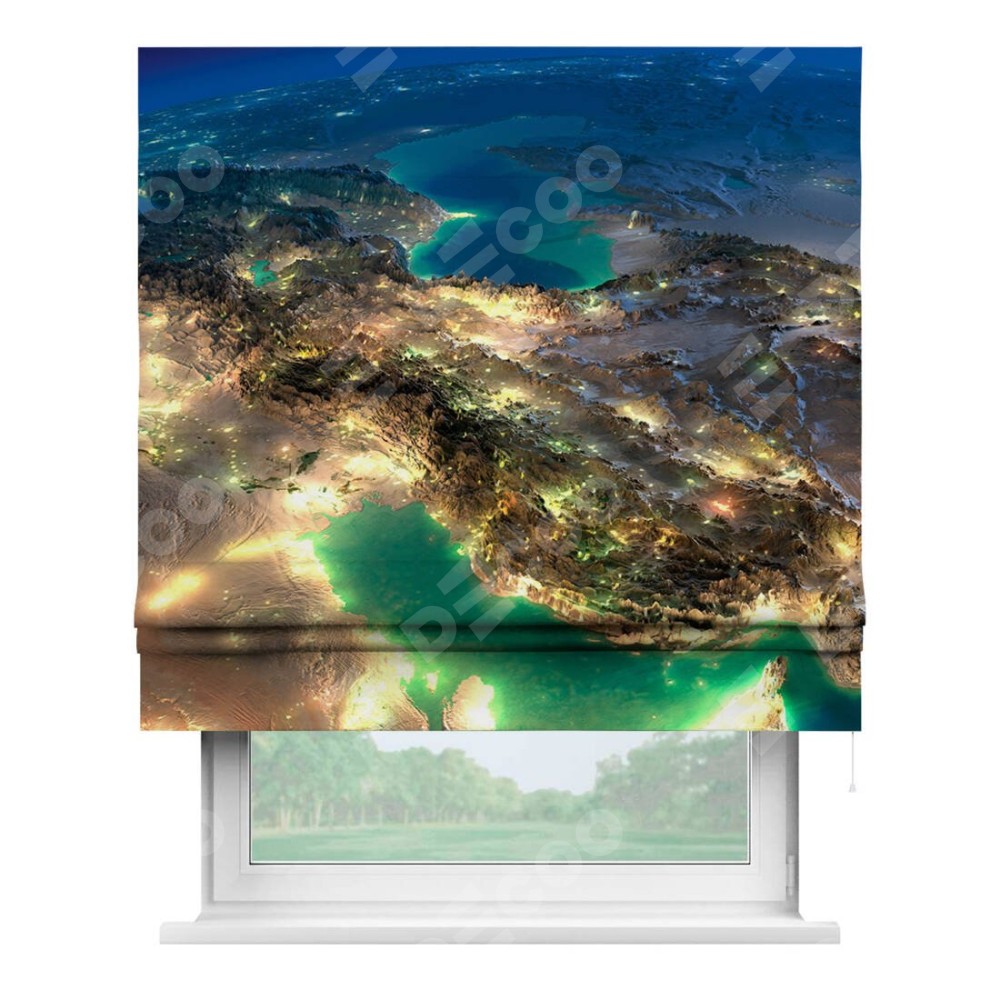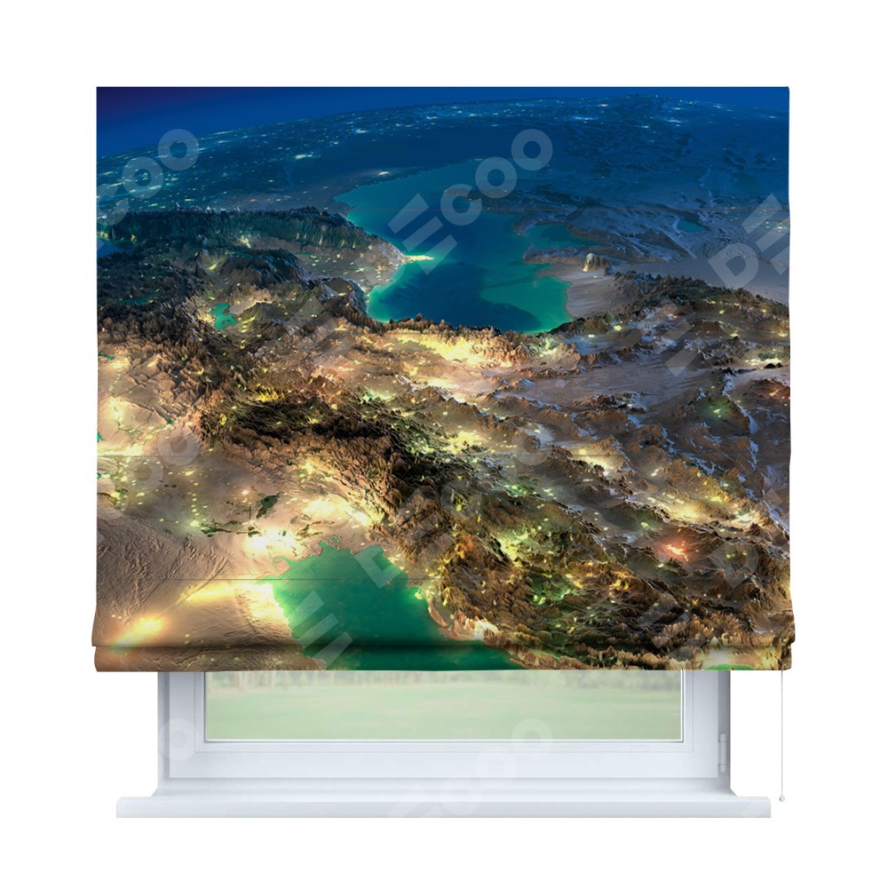 Римская штора производителя «Cortin», используется для проёма, пошита из ткани блэкаут с нанесением сублимационной печати «Ночные огни». Имеет универсальный механизм и подходит для монтажа: на потолок, на стену и в нишу.
