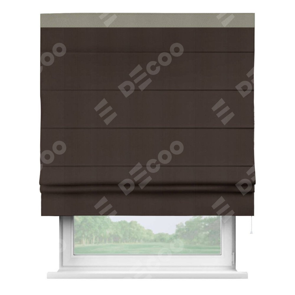 Римская штора производителя «Cortin», используется для проёма, пошита из ткани блэкаут однотонный тёмно-коричневый, артикул ткани 88287. Отделка шторы кантом «Кинг», ткань для канта используется из блэкаута однотонного разной расцветки на выбор. Имеет универсальный механизм и подходит для монтажа: на потолок, на стену и в нишу.