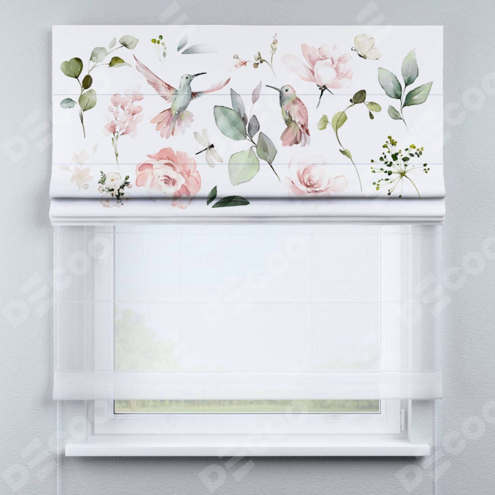 Римская штора день-ночь производителя «Cortin», используется для проёма, пошита из двух полотен, с лицевой блэкаут с нанесением сублимационной печати «Уютный сад», вторая ткань тюль (по стандарту комплектуется тюль белого цвета артикул V-01). Имеет универсальный механизм и подходит для монтажа: на потолок, на стену и в нишу.