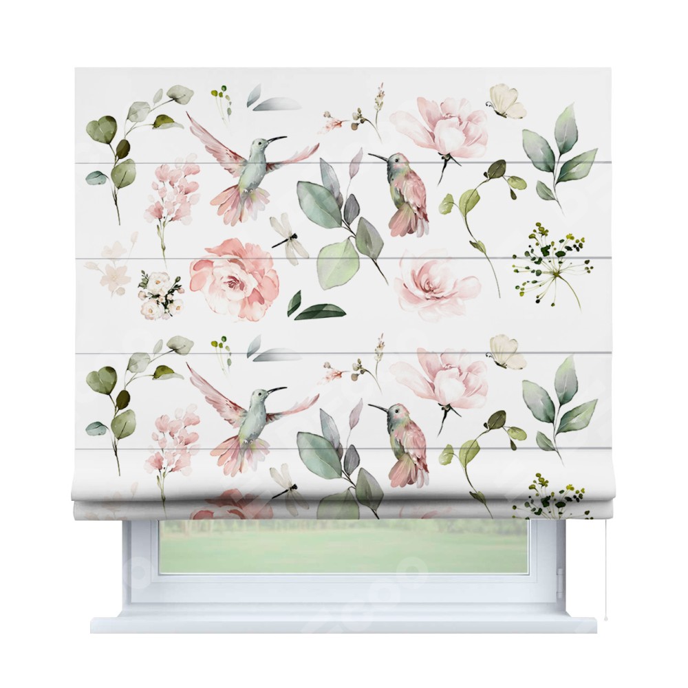 Римская штора производителя «Cortin», используется для проёма, пошита из ткани блэкаут с нанесением сублимационной печати «Уютный сад». Имеет универсальный механизм и подходит для монтажа: на потолок, на стену и в нишу.
