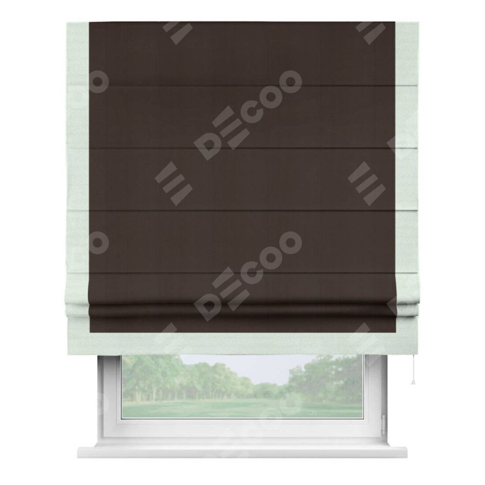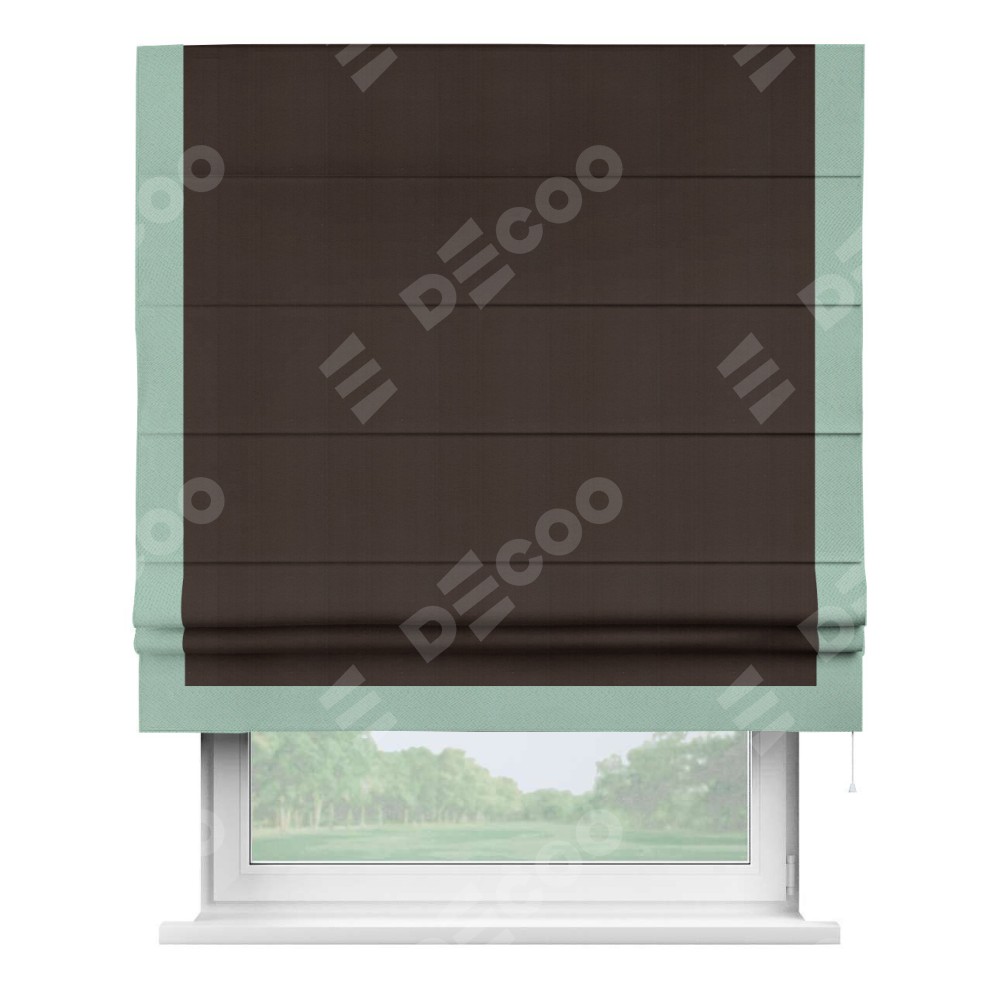 Римская штора производителя «Cortin», используется для проёма, пошита из ткани блэкаут однотонный тёмно-коричневый, артикул ткани 88287. Отделка шторы кантом «Виктория», ткань для канта используется из блэкаута однотонного разной расцветки на выбор. Имеет универсальный механизм и подходит для монтажа: на потолок, на стену и в нишу.