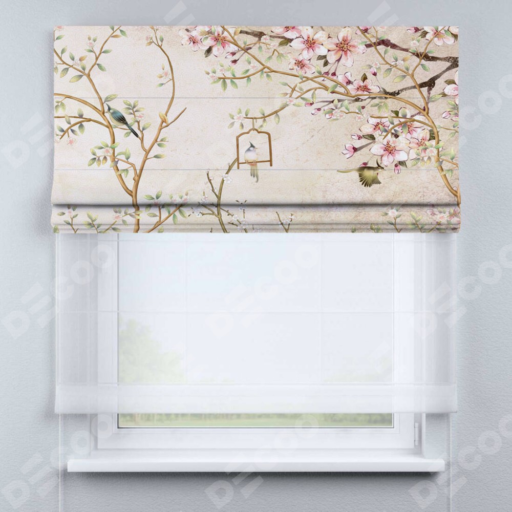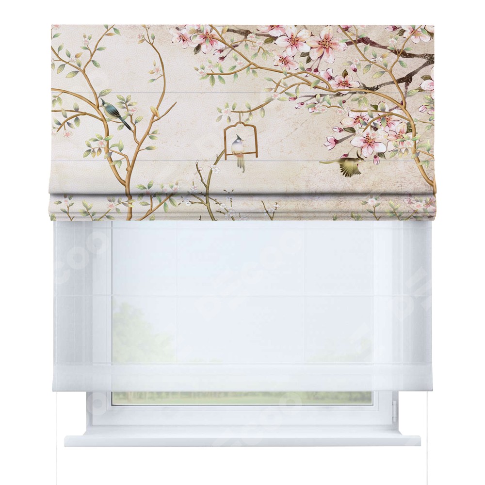 Римская штора день-ночь производителя «Cortin», используется для проёма, пошита из двух полотен, с лицевой блэкаут с нанесением сублимационной печати «Весенний сад», вторая ткань тюль (по стандарту комплектуется тюль белого цвета артикул V-01). Имеет универсальный механизм и подходит для монтажа: на потолок, на стену и в нишу.