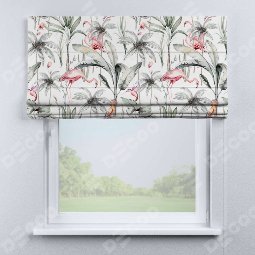 Римская штора производителя «Cortin», используется для проёма, пошита из ткани блэкаут с нанесением сублимационной печати «Изящные фламинго». Имеет универсальный механизм и подходит для монтажа: на потолок, на стену и в нишу.