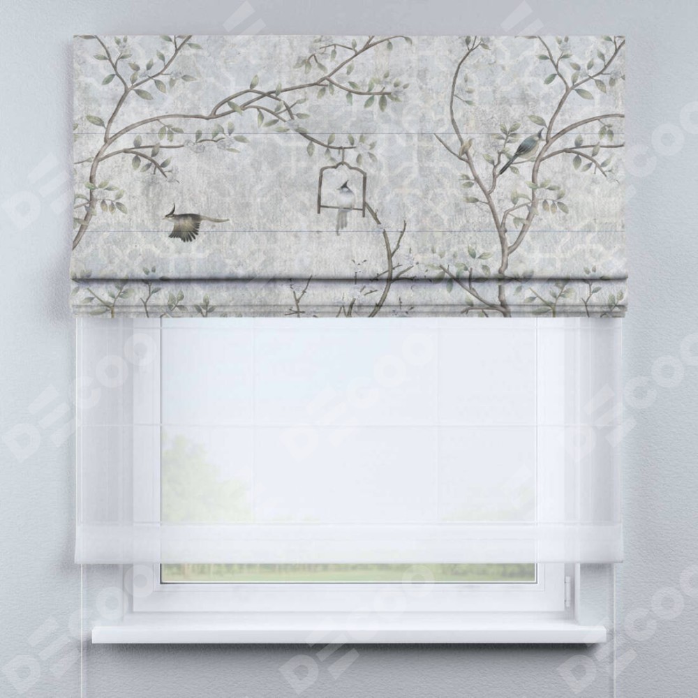 Римская штора день-ночь производителя «Cortin», используется для проёма, пошита из двух полотен, с лицевой блэкаут с нанесением сублимационной печати «Лунный сад», вторая ткань тюль (по стандарту комплектуется тюль белого цвета артикул V-01). Имеет универсальный механизм и подходит для монтажа: на потолок, на стену и в нишу.