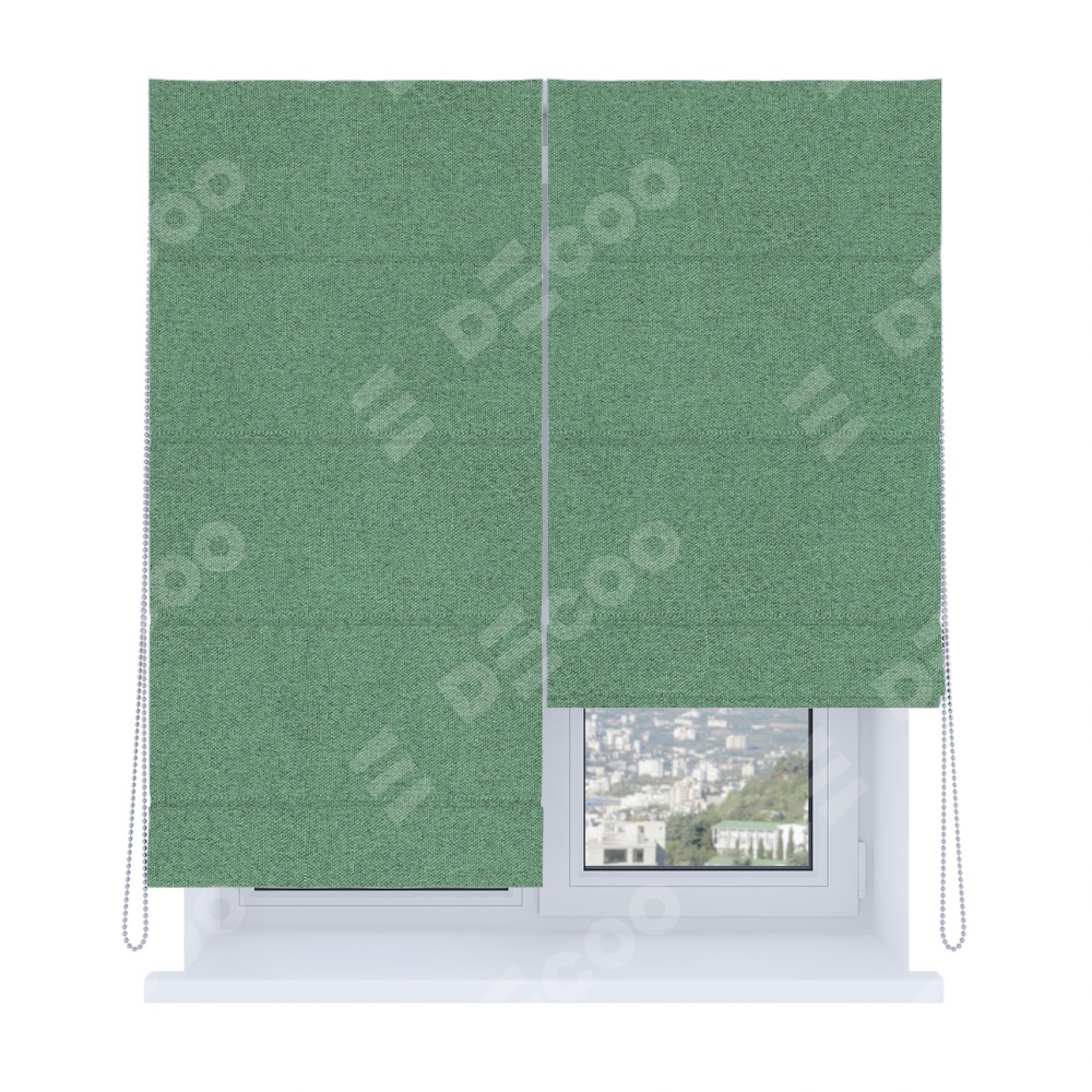 Римская штора производителя «Cortin», используется для проёма, пошита из ткани лён блэкаут светло-бирюзовый, артикул ткани 69443. Имеет универсальный механизм и подходит для монтажа: на потолок, на стену и в нишу. Удобное управление каждой шторой отдельно.