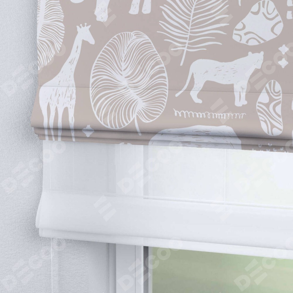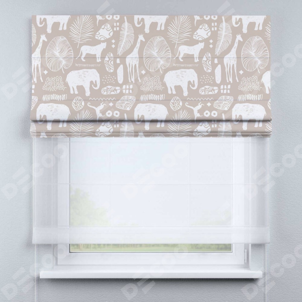 Римская штора день-ночь производителя «Cortin», используется для проёма, пошита из двух полотен, с лицевой блэкаут с нанесением сублимационной печати «Африканские животные», вторая ткань тюль (по стандарту комплектуется тюль белого цвета артикул V-01). Имеет универсальный механизм и подходит для монтажа: на потолок, на стену и в нишу.