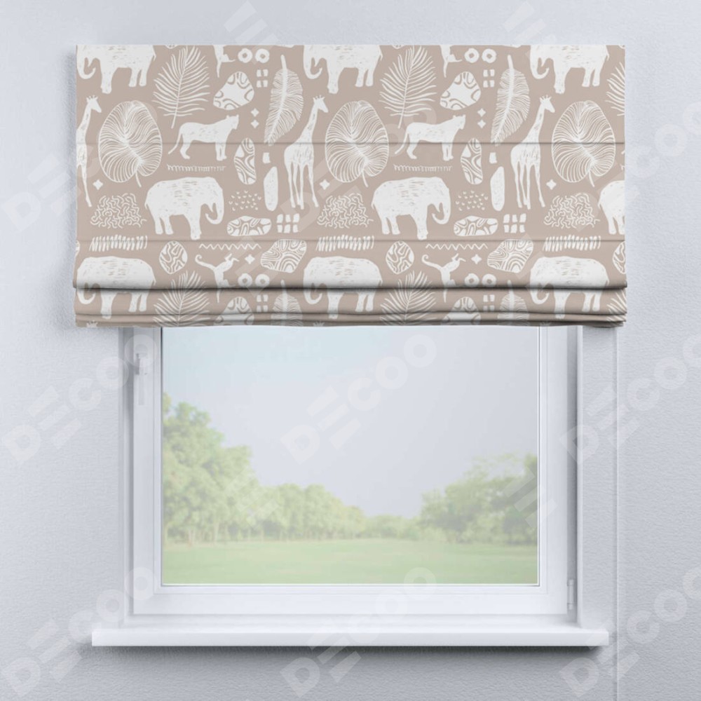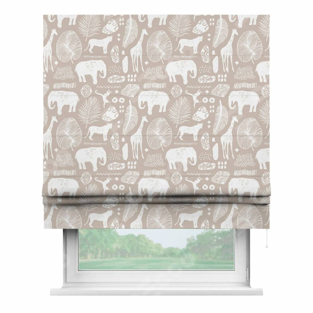 Римская штора производителя «Cortin», используется для проёма, пошита из ткани блэкаут с нанесением сублимационной печати «Африканские животные». Имеет универсальный механизм и подходит для монтажа: на потолок, на стену и в нишу.