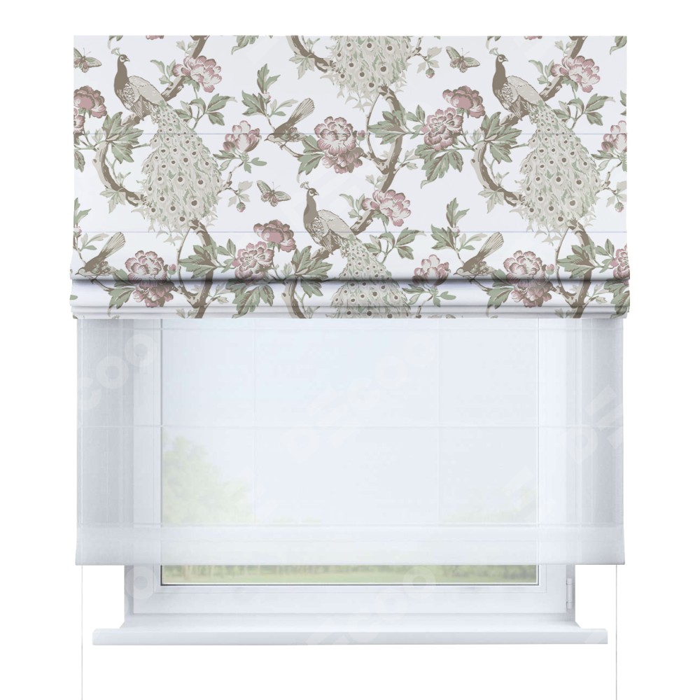 Римская штора день-ночь производителя «Cortin», используется для проёма, пошита из двух полотен, с лицевой блэкаут с нанесением сублимационной печати «Гордые павлины», вторая ткань тюль (по стандарту комплектуется тюль белого цвета артикул V-01). Имеет универсальный механизм и подходит для монтажа: на потолок, на стену и в нишу.