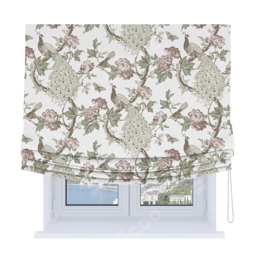 Римская штора Soft производителя «Cortin», используется для проёма, пошита из ткани блэкаут с нанесением сублимационной печати «Гордые павлины». Имеет универсальный механизм и подходит для монтажа: на потолок, на стену и в нишу. В отличие от стандартных римских штор, римская штора Soft не имеет горизонтальных вставок и нижнего отвеса. Это позволяет ткани произвольно драпироваться в свободные мягкие складки.