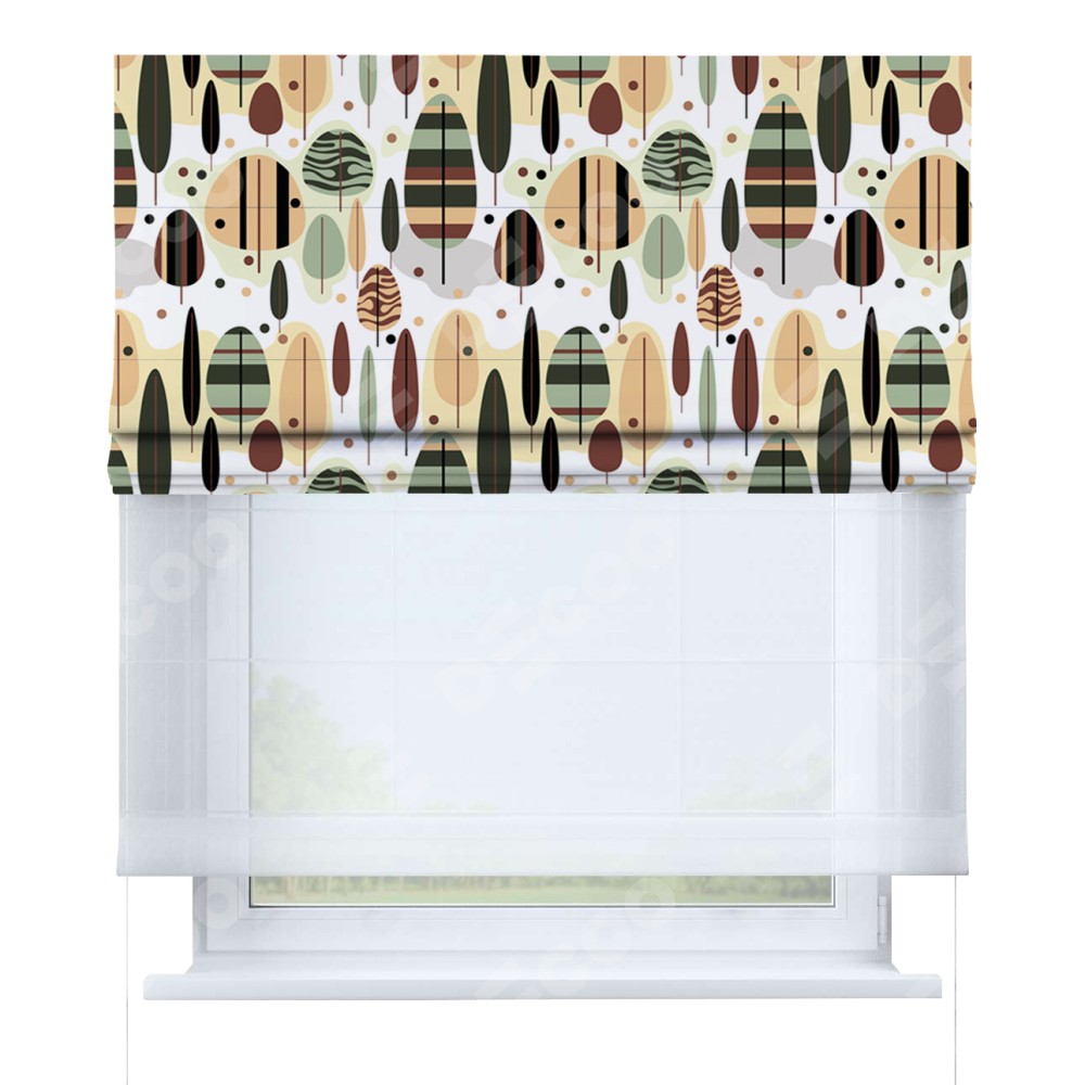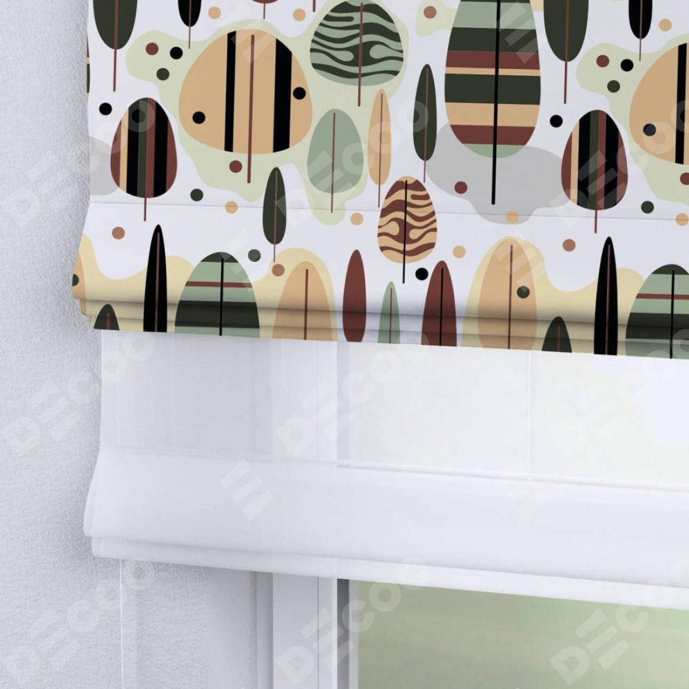 Римская штора день-ночь производителя «Cortin», используется для проёма, пошита из двух полотен, с лицевой блэкаут с нанесением сублимационной печати «Деревья в полоску», вторая ткань тюль (по стандарту комплектуется тюль белого цвета артикул V-01). Имеет универсальный механизм и подходит для монтажа: на потолок, на стену и в нишу.