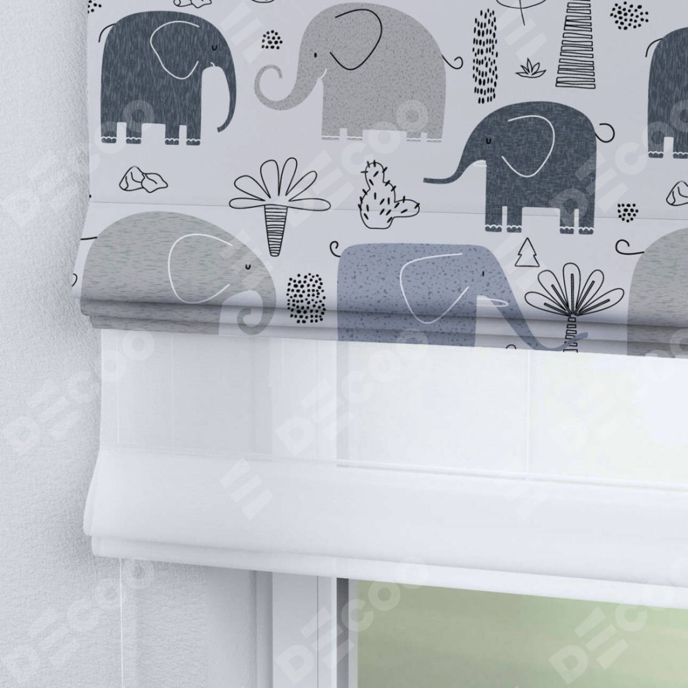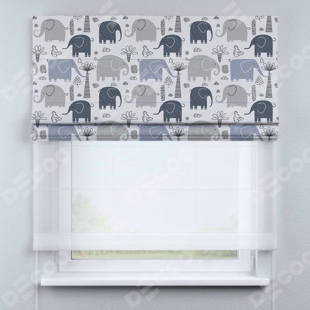 Римская штора день-ночь производителя «Cortin», используется для проёма, пошита из двух полотен, с лицевой блэкаут с нанесением сублимационной печати «Серые слоники», вторая ткань тюль (по стандарту комплектуется тюль белого цвета артикул V-01). Имеет универсальный механизм и подходит для монтажа: на потолок, на стену и в нишу.
