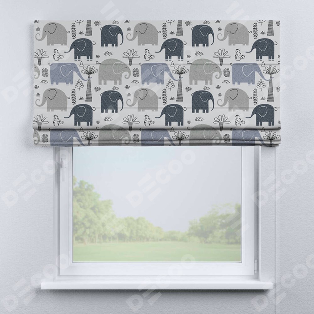 Римская штора производителя «Cortin», используется для проёма, пошита из ткани блэкаут с нанесением сублимационной печати «Серые слоники». Имеет универсальный механизм и подходит для монтажа: на потолок, на стену и в нишу.