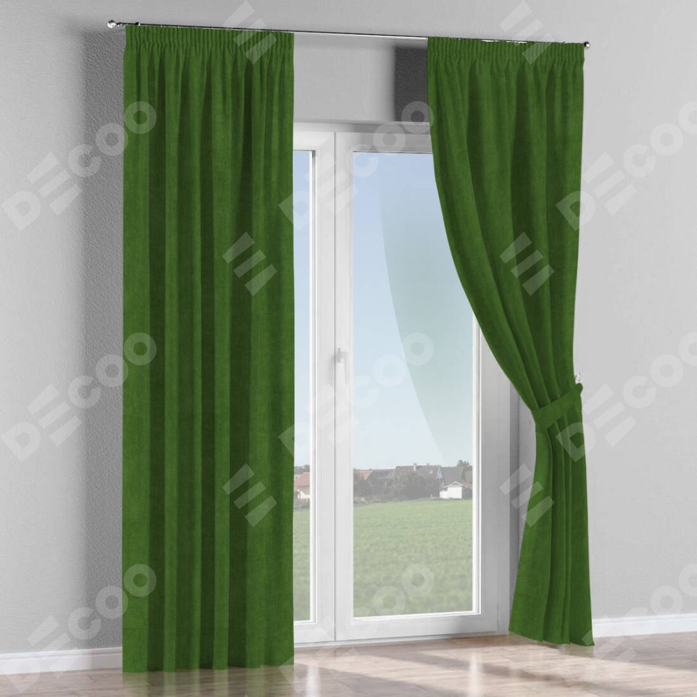 Комплект прямых штор, от производителя «Cortin», пошиты из ткани вельвет тёмно-салатовый, артикул ткани 33805. С изнаночной стороны в верхней части штор пристрачивается шторная лента с декоративными складками «Карандаш». Для создания элегантных складок прямые шторы шьются по стандарту с коэффициентом 1:2 (на 100 см. ширины проёма 200 см. ширины ткани).