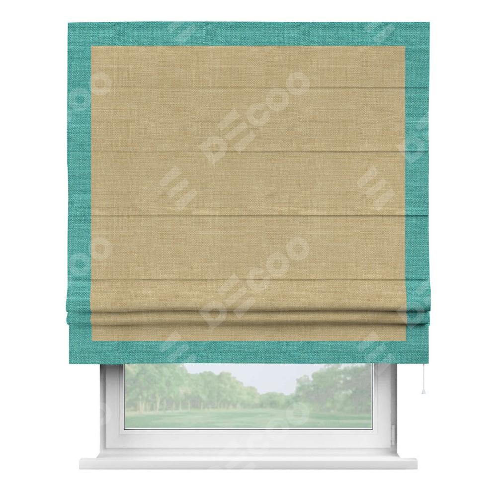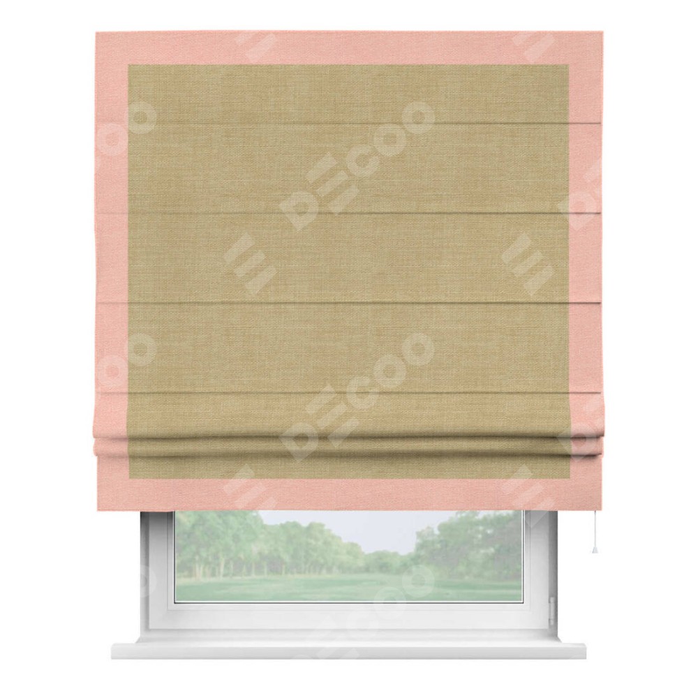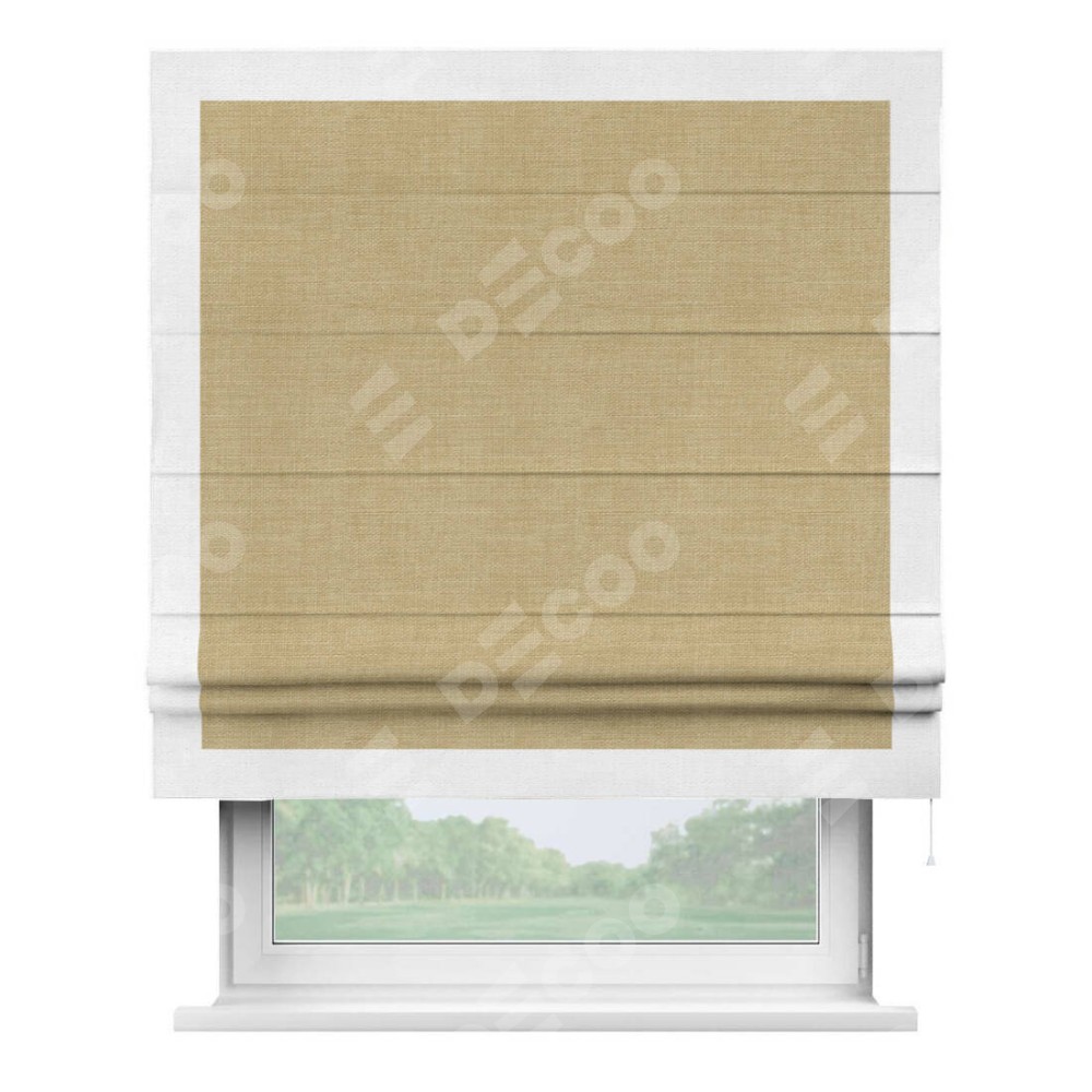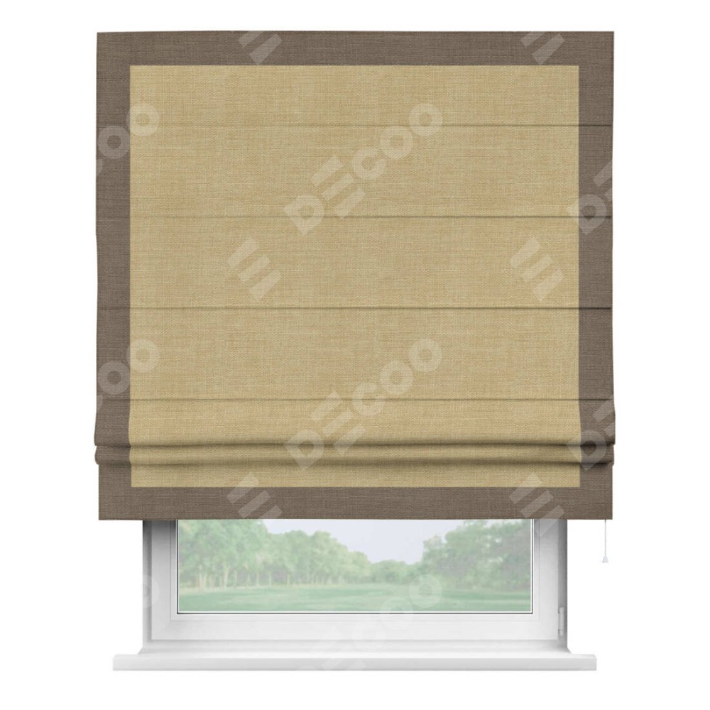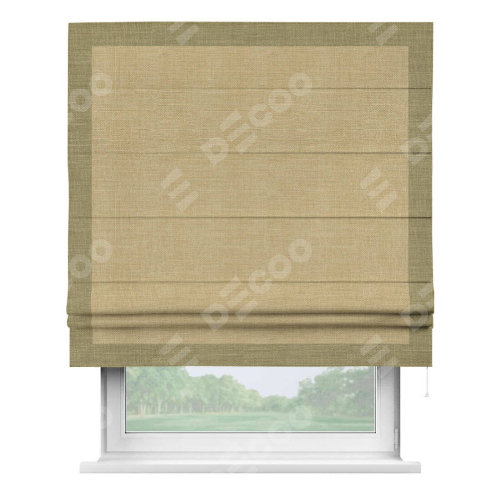 Римская штора производителя «Cortin», используется для проёма, пошита из ткани лён бежевый, артикул 7442. Отделка шторы кантом «Чесс», ткань для канта используется из льна разной расцветки на выбор. Имеет универсальный механизм и подходит для монтажа: на потолок, на стену и в нишу.