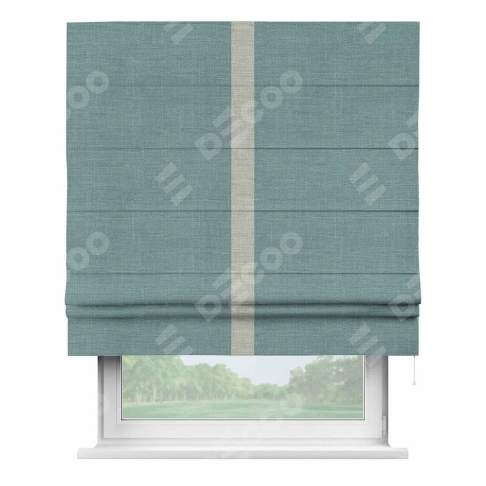 Римская штора производителя «Cortin», используется для проёма, пошита из ткани лён голубой, артикул 74736. Отделка шторы кантом «Хайвэй», ткань для канта используется из льна разной расцветки на выбор. Имеет универсальный механизм и подходит для монтажа: на потолок, на стену и в нишу.