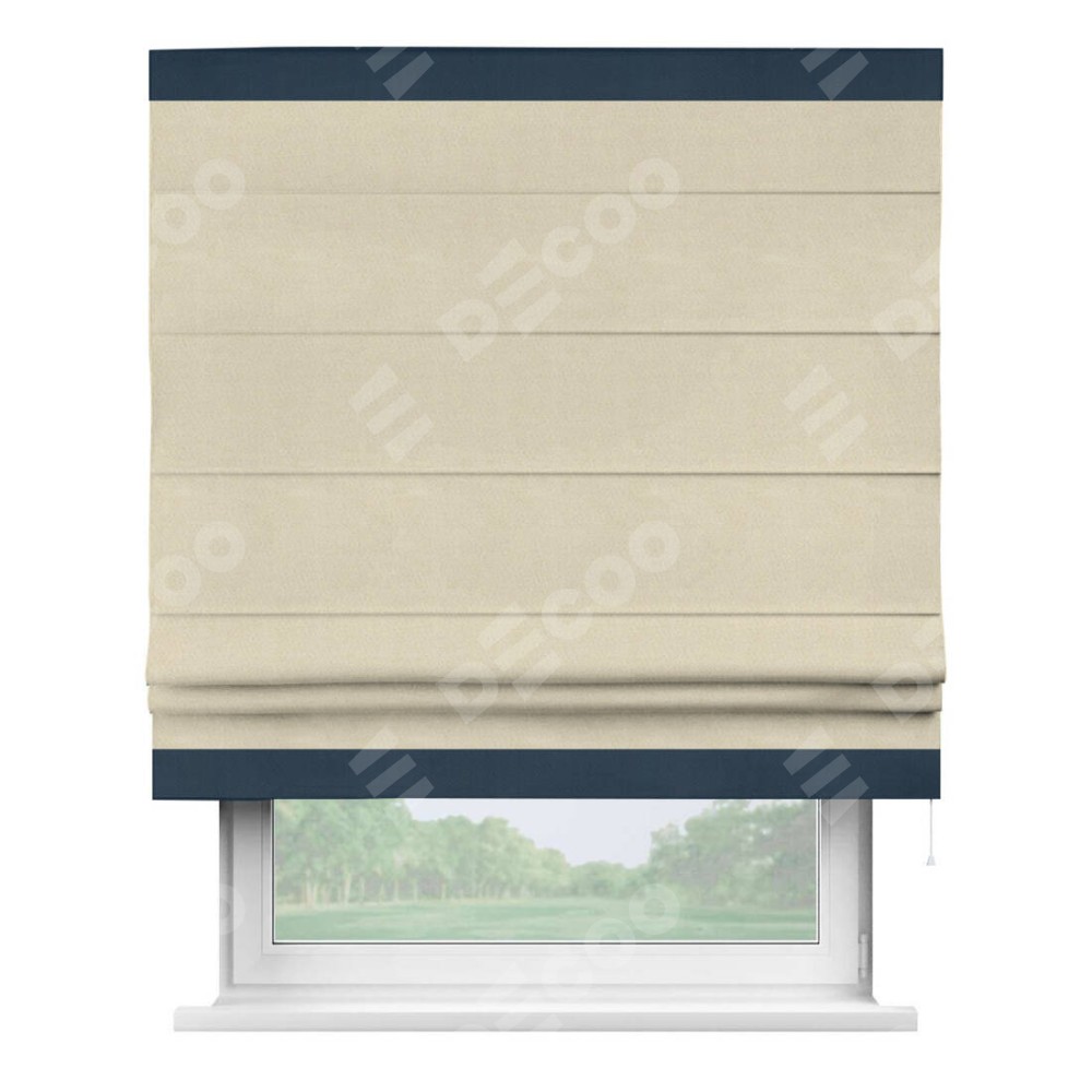 Римская штора производителя «Cortin», используется для проёма, пошита из ткани блэкаут однотонный бежевый, артикул ткани 13125. Отделка шторы кантом «Горизонт», ткань для канта используется из блэкаута однотонного разной расцветки на выбор. Имеет универсальный механизм и подходит для монтажа: на потолок, на стену и в нишу.