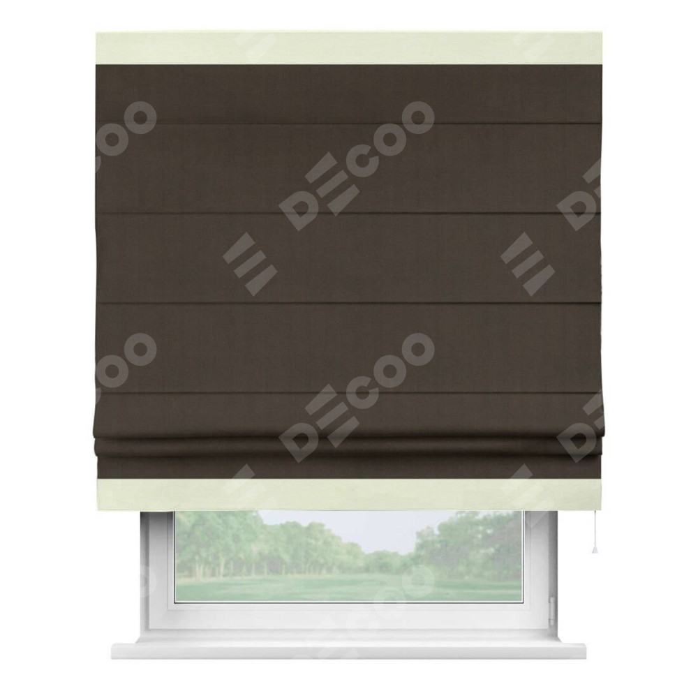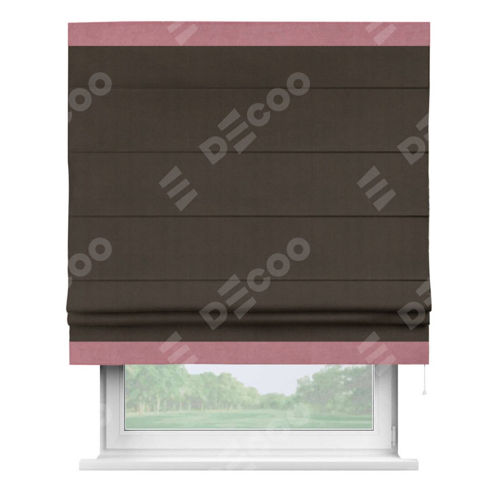 Римская штора производителя «Cortin», используется для проёма, пошита из ткани вельвет тёмно-коричневый, артикул ткани 30991. Отделка шторы кантом «Горизонт», ткань для канта используется из вельвета разной расцветки на выбор. Имеет универсальный механизм и подходит для монтажа: на потолок, на стену и в нишу.