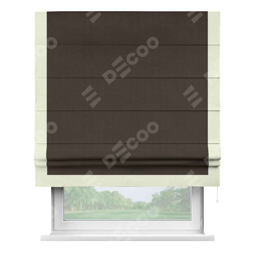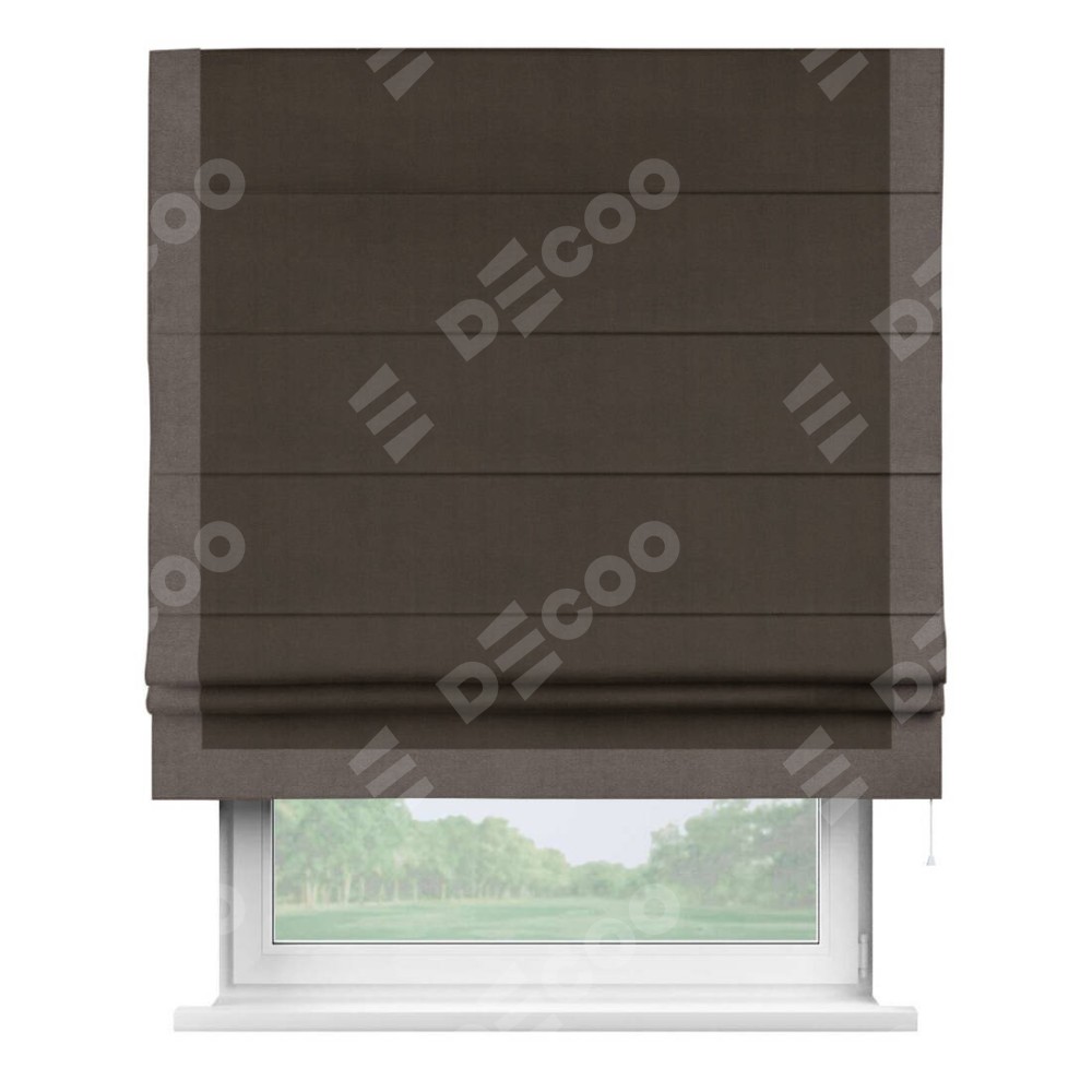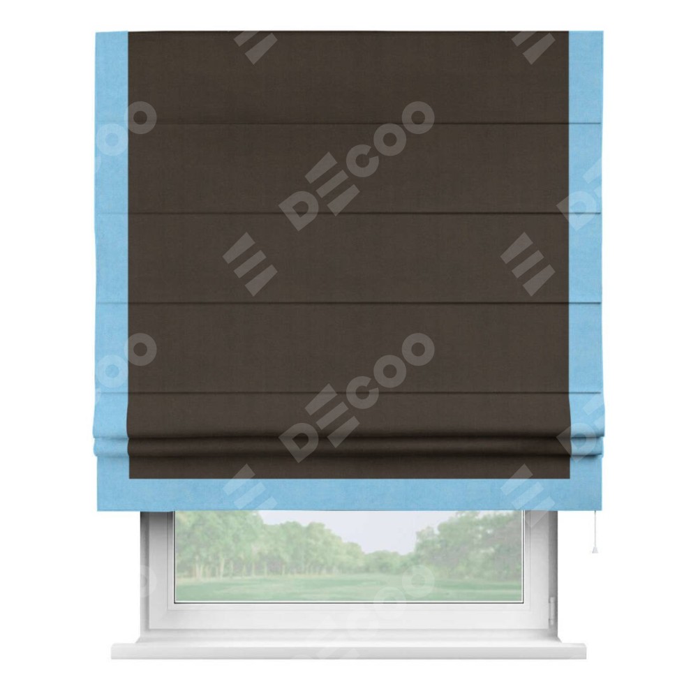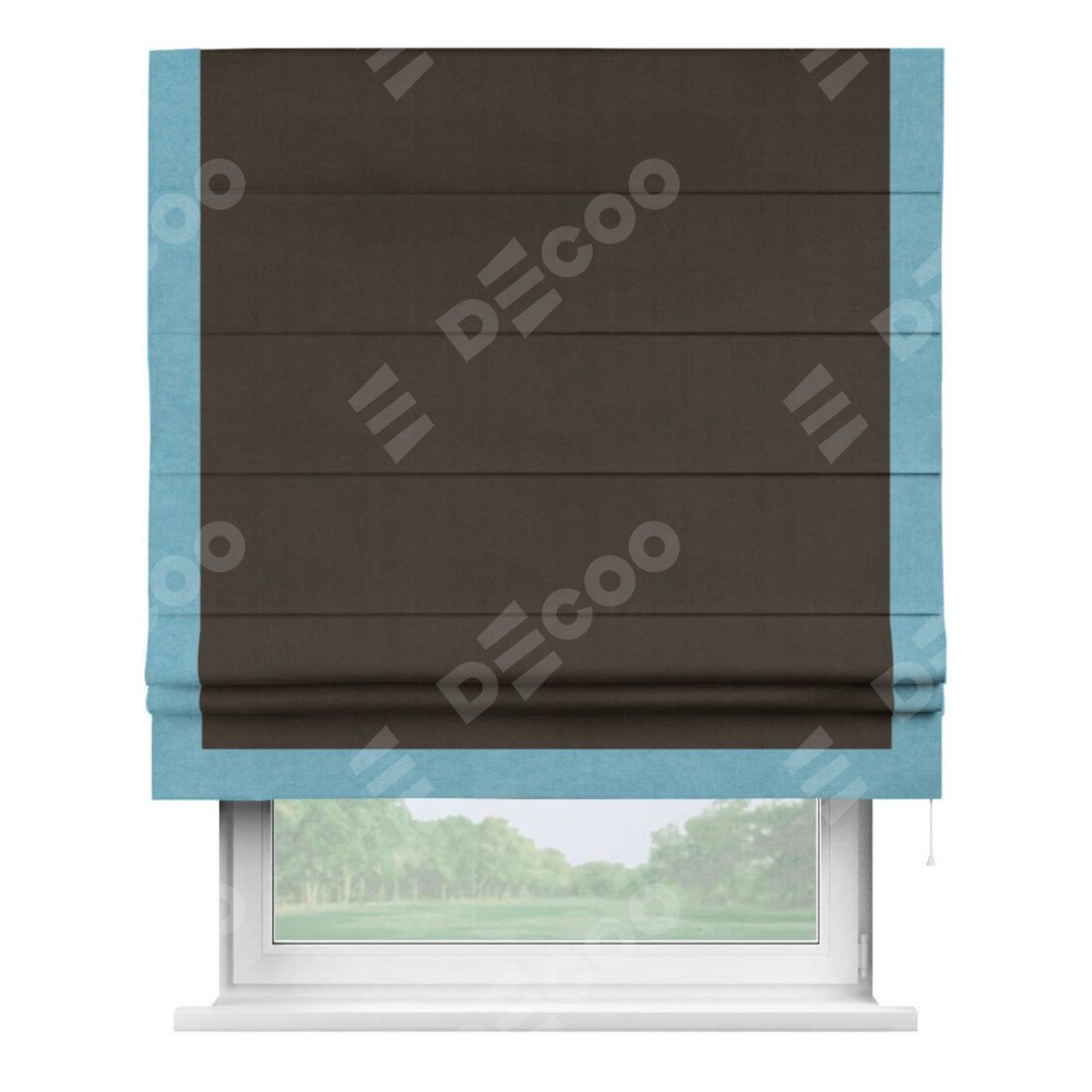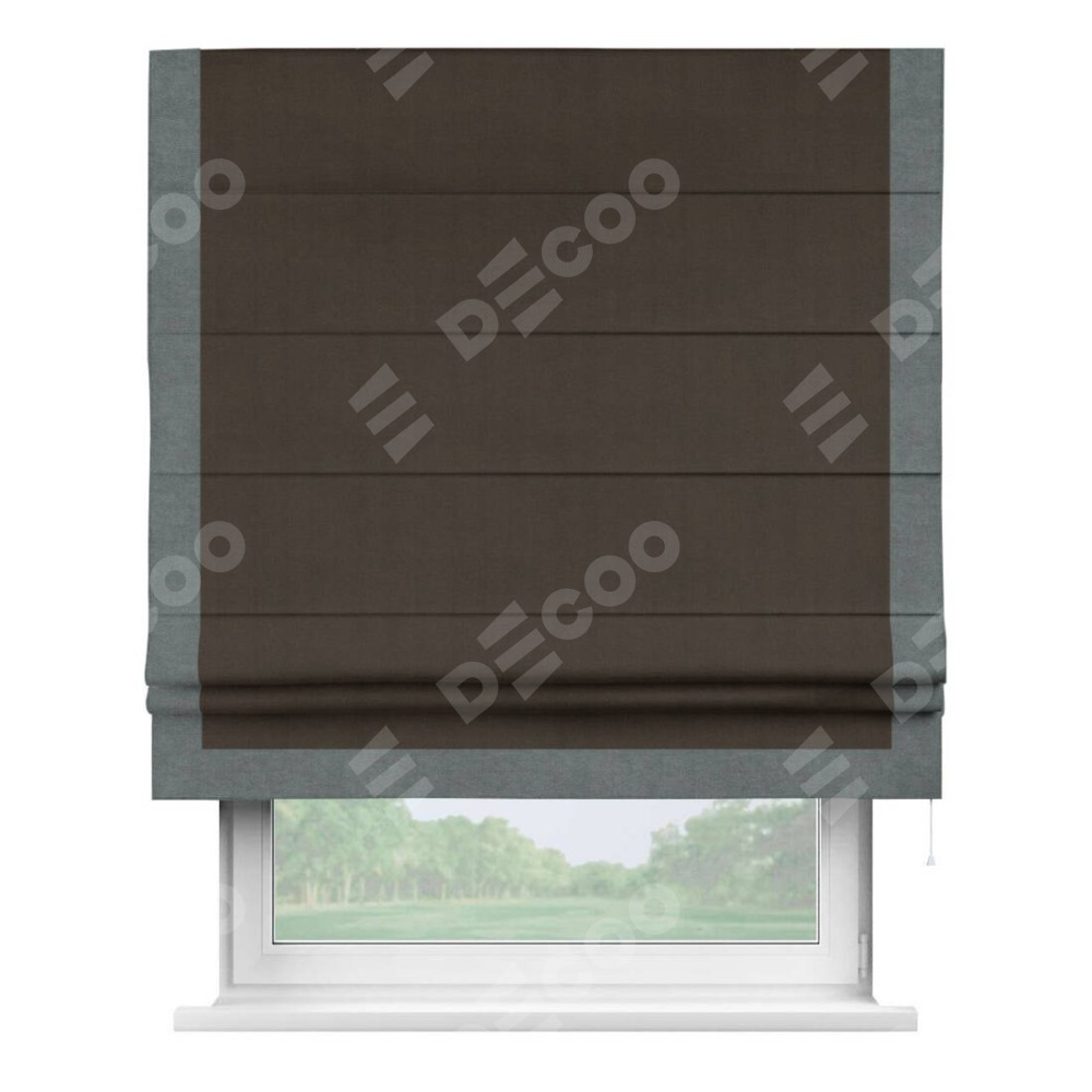 Римская штора производителя «Cortin», используется для проёма, пошита из ткани вельвет тёмно-коричневый, артикул ткани 30991. Отделка шторы кантом «Виктория», ткань для канта используется из вельвета разной расцветки на выбор. Имеет универсальный механизм и подходит для монтажа: на потолок, на стену и в нишу.
