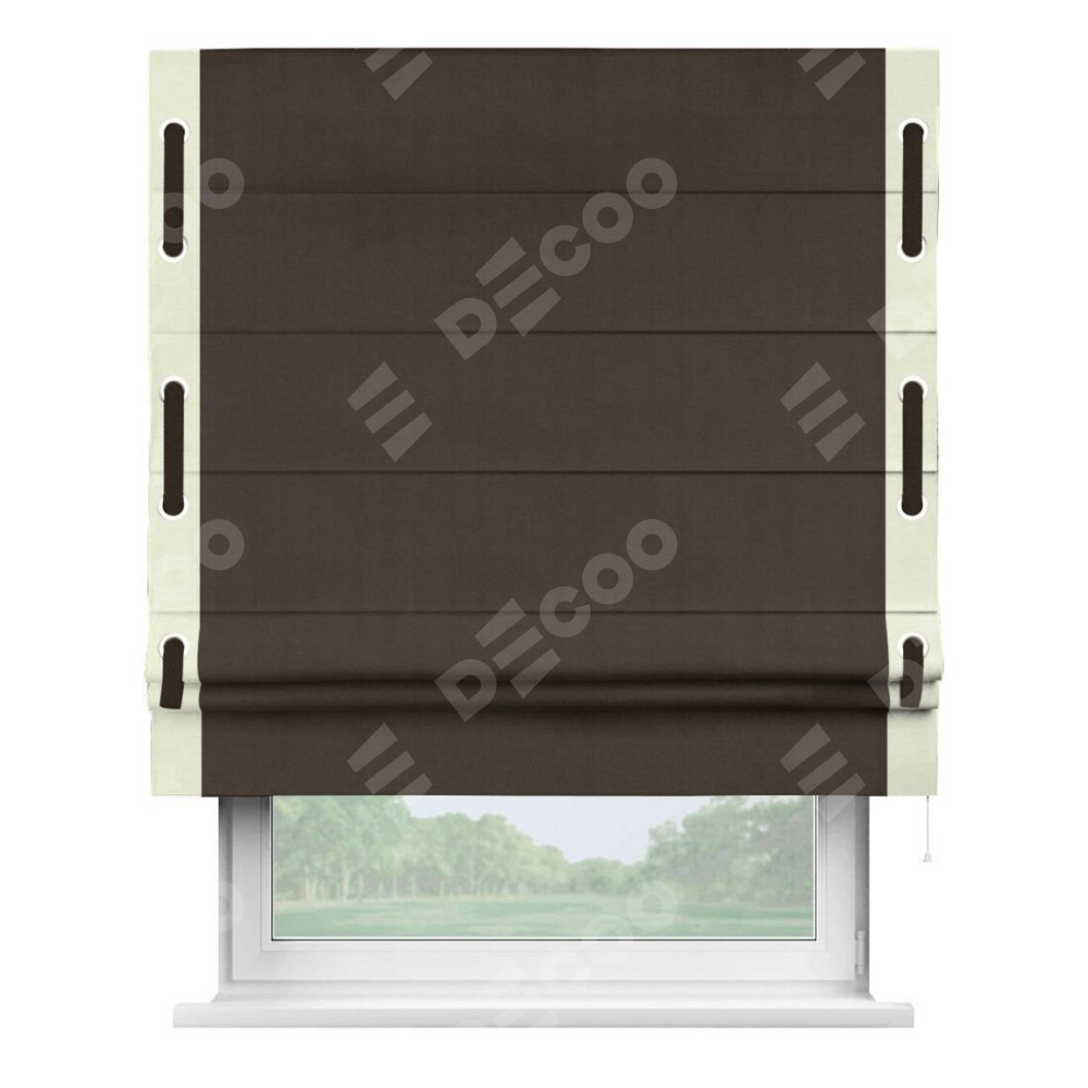 Римская штора производителя «Cortin», используется для проёма, пошита из ткани вельвет тёмно-коричневый, артикул ткани 30991. Отделка шторы кантом «Стрим Дуо» на кантах расположены люверсы с пояском, ткань для канта используется из вельвета разной расцветки на выбор. Ткань для пояска обычно используется из основной ткани шторы, а так же можно сделать из любой расцветки по желанию. Имеет универсальный механизм и подходит для монтажа: на потолок, на стену и в нишу.