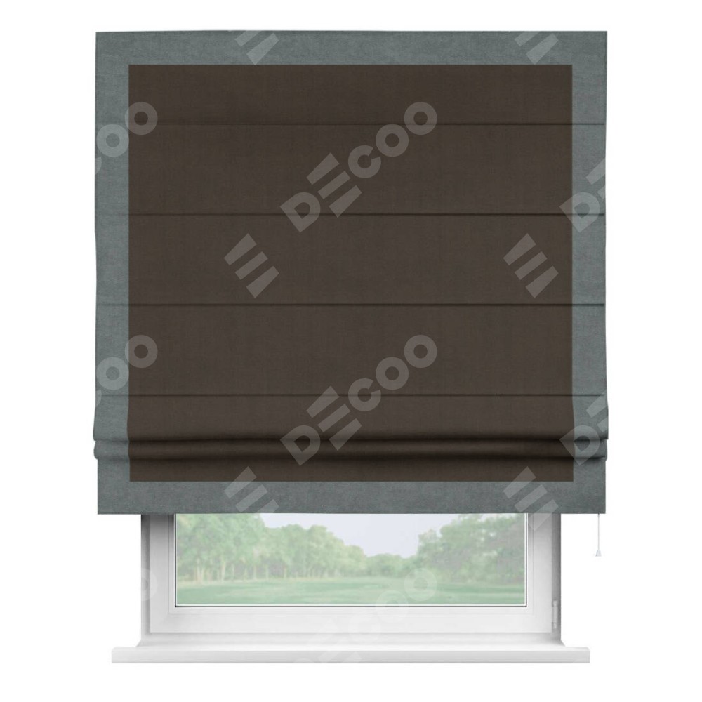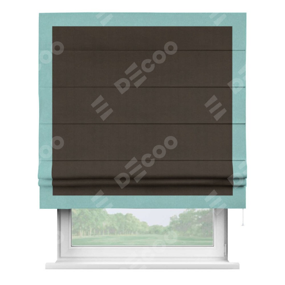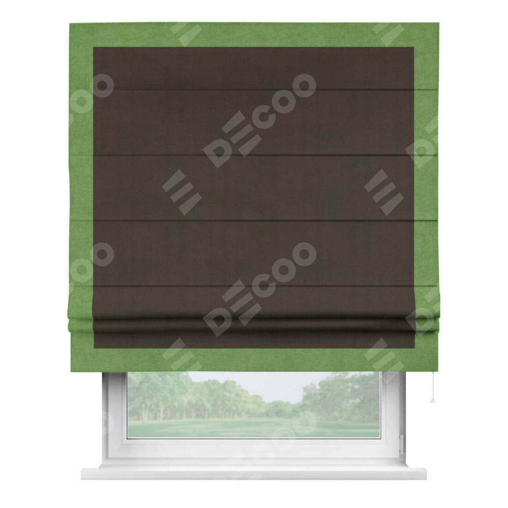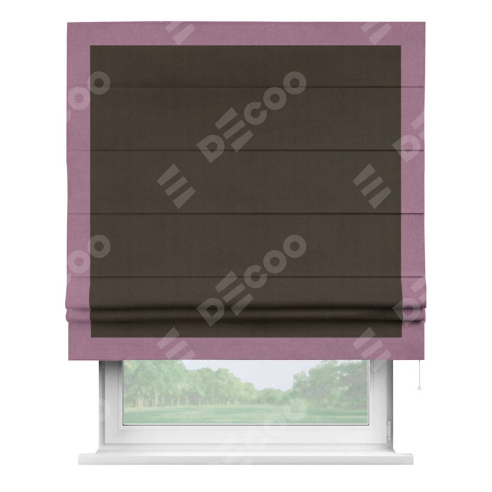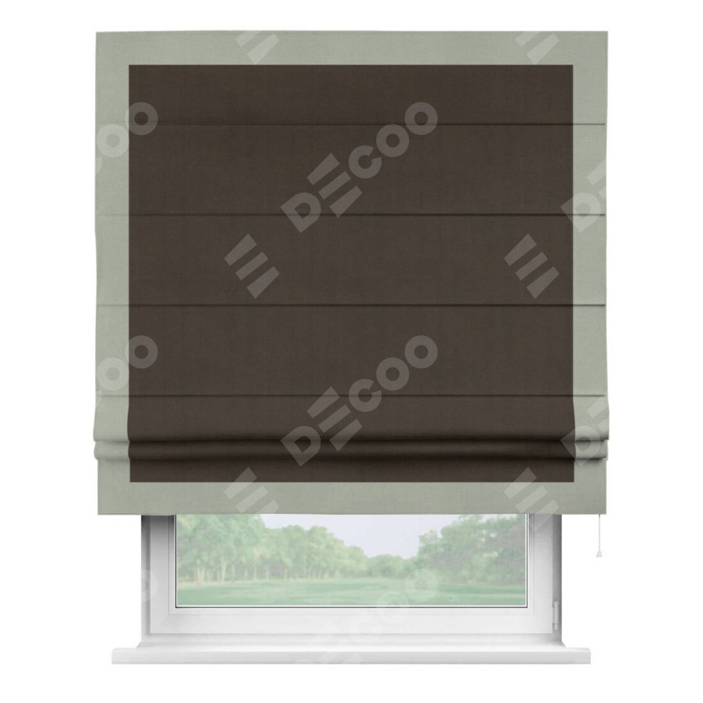 Римская штора производителя «Cortin», используется для проёма, пошита из ткани вельвет тёмно-коричневый, артикул ткани 30991. Отделка шторы кантом «Чесс», ткань для канта используется из вельвета разной расцветки на выбор. Имеет универсальный механизм и подходит для монтажа: на потолок, на стену и в нишу.