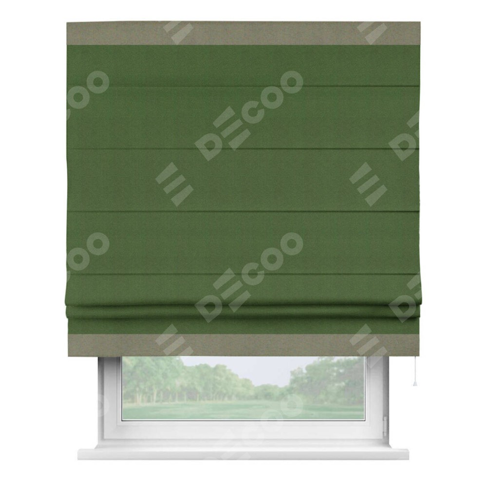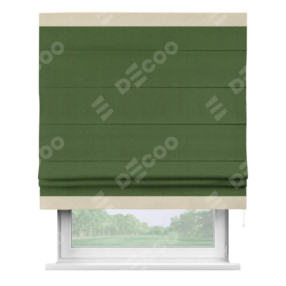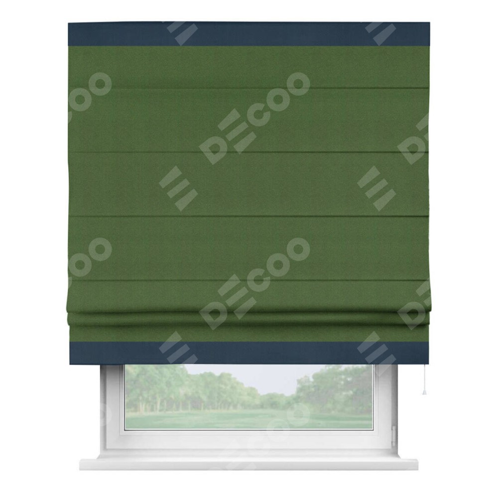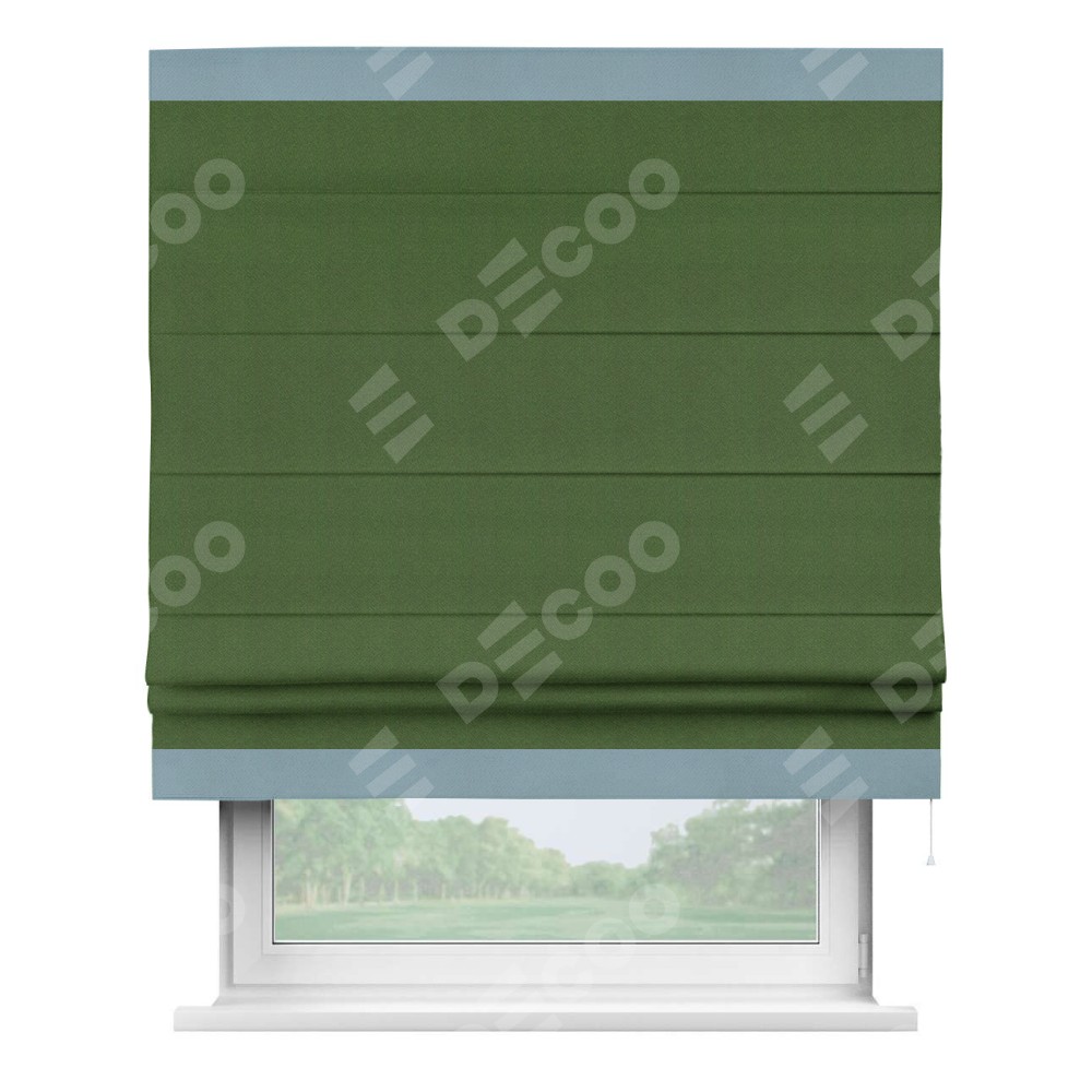 Римская штора производителя «Cortin», используется для проёма, пошита из ткани блэкаут однотонный зелёный перламутр, артикул ткани 81859−2. Отделка шторы кантом «Горизонт», ткань для канта используется из блэкаута однотонного разной расцветки на выбор. Имеет универсальный механизм и подходит для монтажа: на потолок, на стену и в нишу.