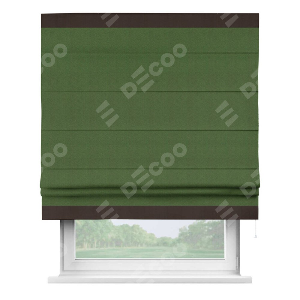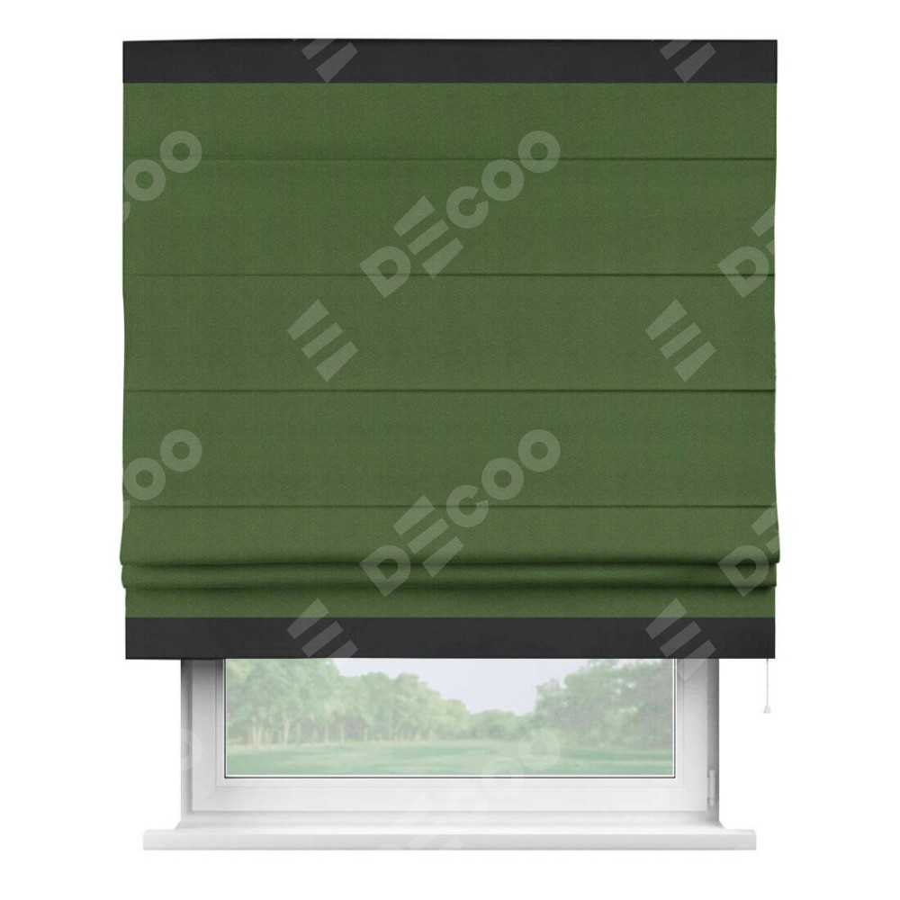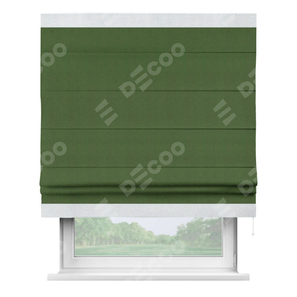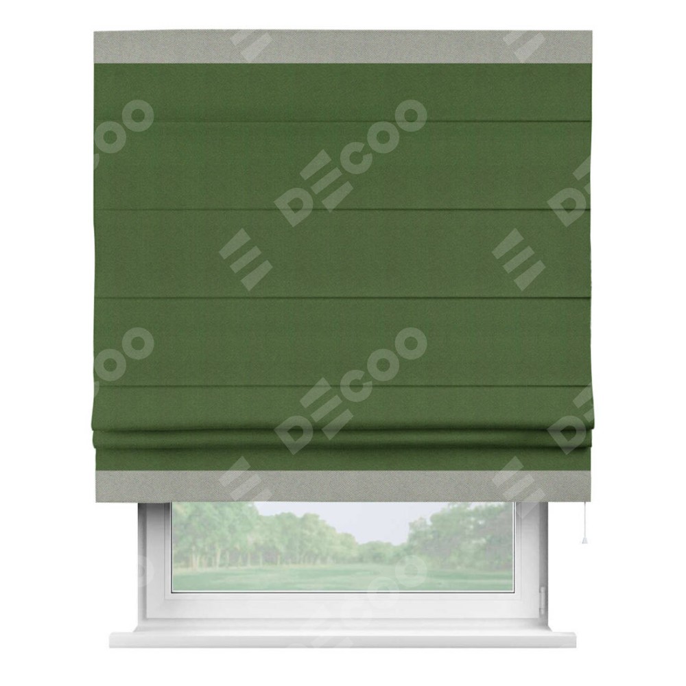 Римская штора производителя «Cortin», используется для проёма, пошита из ткани блэкаут однотонный зелёный перламутр, артикул ткани 81859−2. Отделка шторы кантом «Горизонт», ткань для канта используется из блэкаута однотонного разной расцветки на выбор. Имеет универсальный механизм и подходит для монтажа: на потолок, на стену и в нишу.