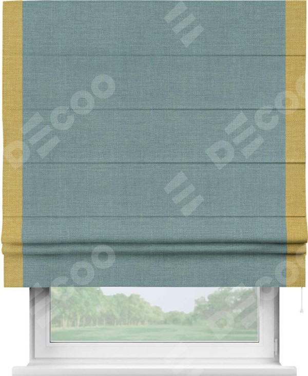 Римская штора производителя «Cortin», используется для проёма, пошита из ткани лён голубой, артикул 74736. Отделка шторы кантом «Стрим Дуо», ткань для канта используется из льна разной расцветки на выбор. Имеет универсальный механизм и подходит для монтажа: на потолок, на стену и в нишу.