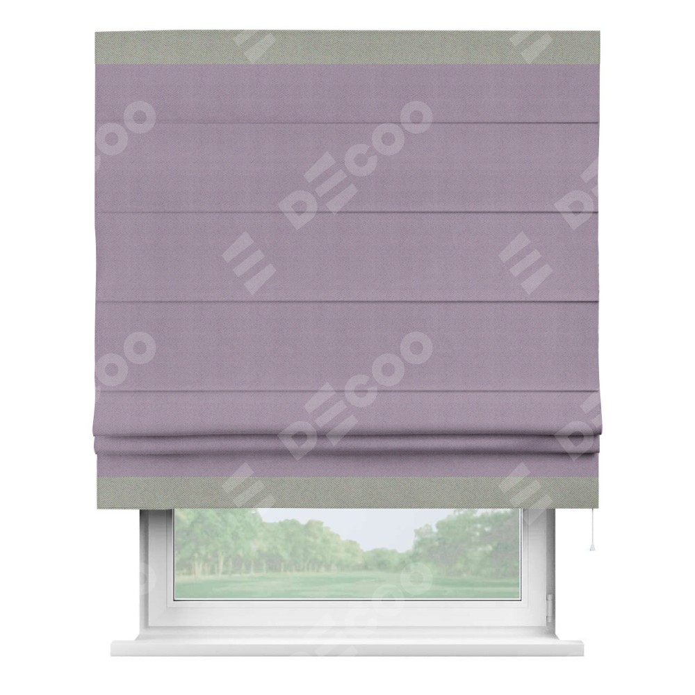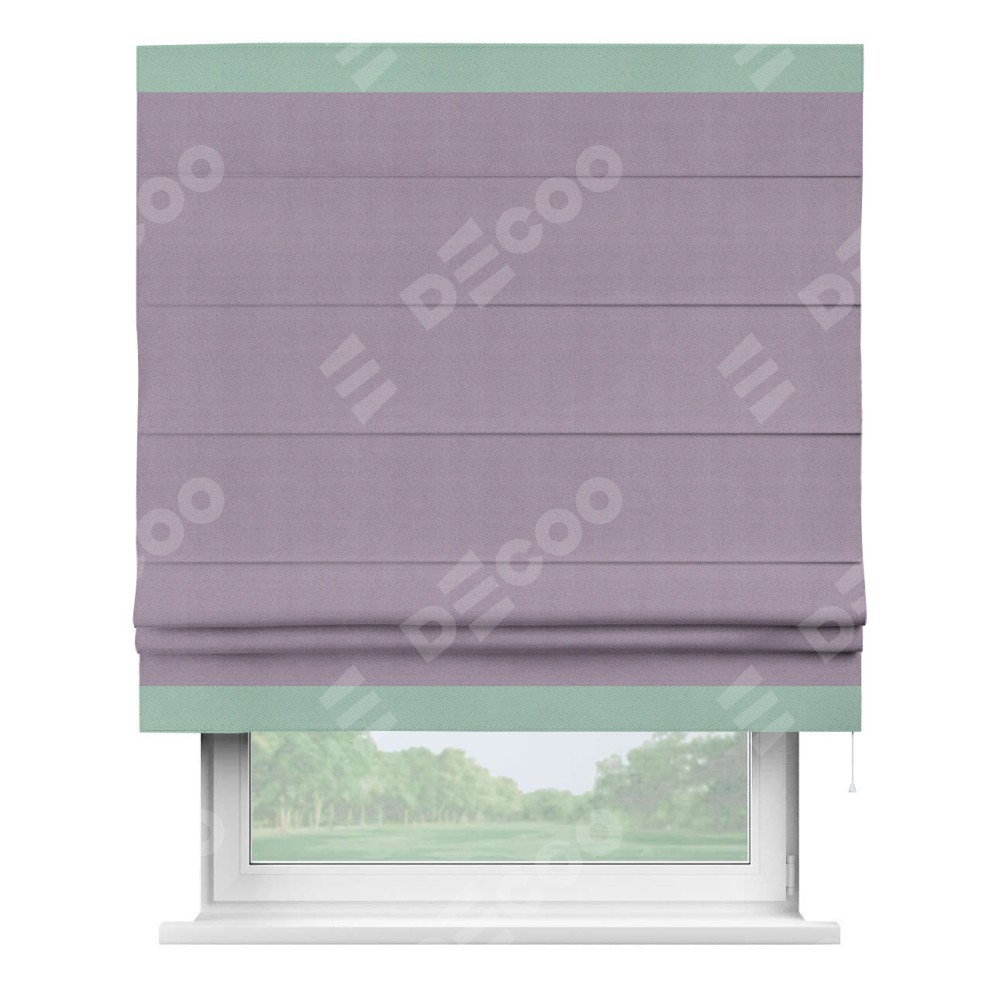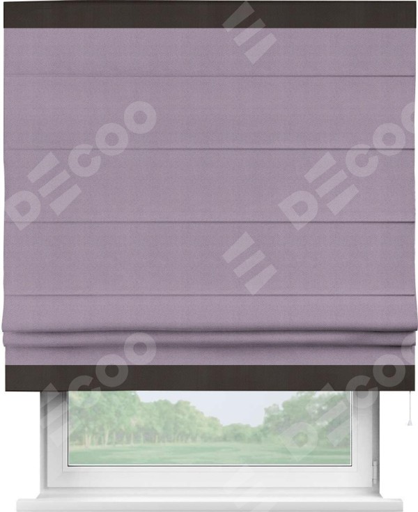 Римская штора производителя «Cortin», используется для проёма, пошита из ткани блэкаут однотонный светло-сиреневый, артикул ткани 29333−1. Отделка шторы кантом «Горизонт», ткань для канта используется из блэкаута однотонного разной расцветки на выбор. Имеет универсальный механизм и подходит для монтажа: на потолок, на стену и в нишу.