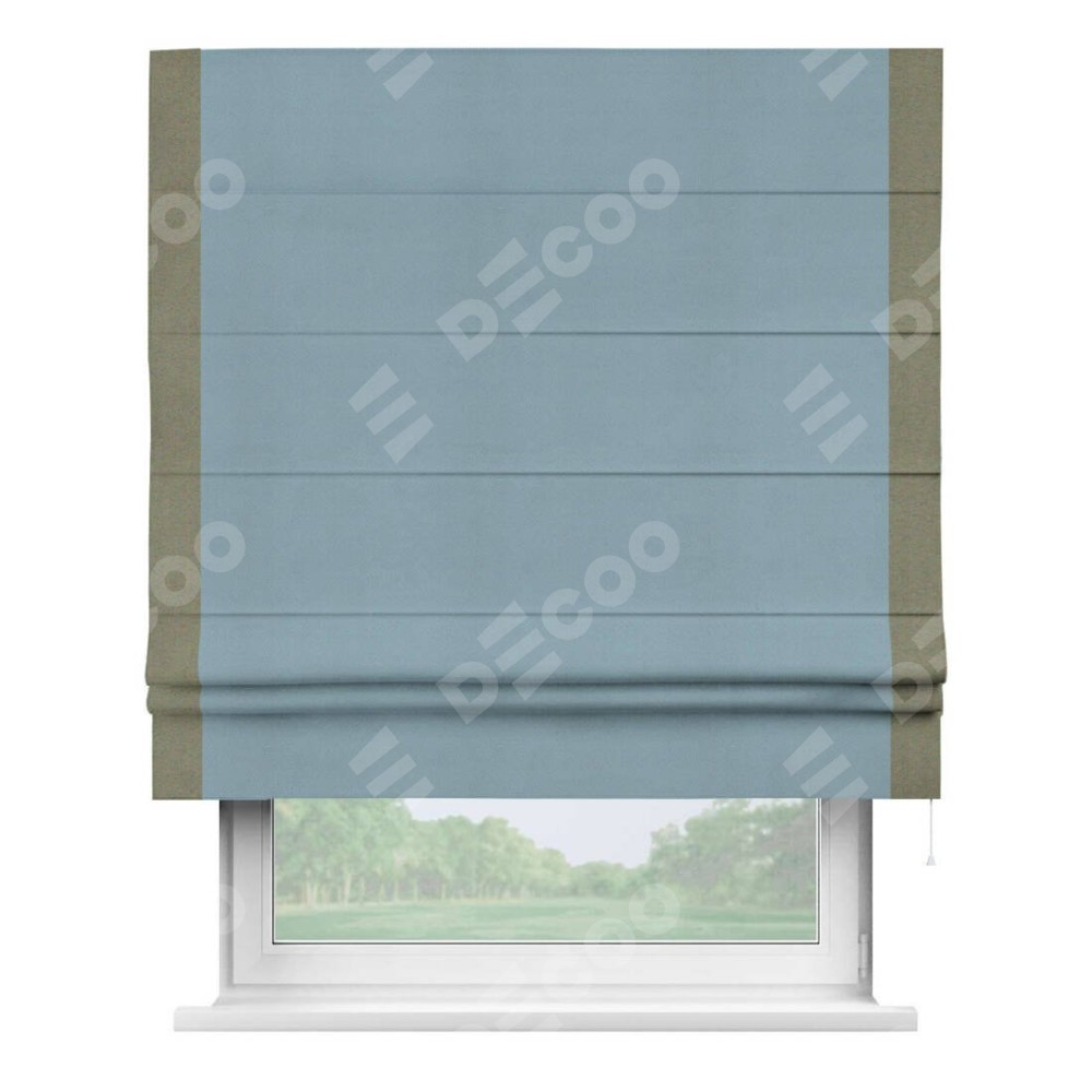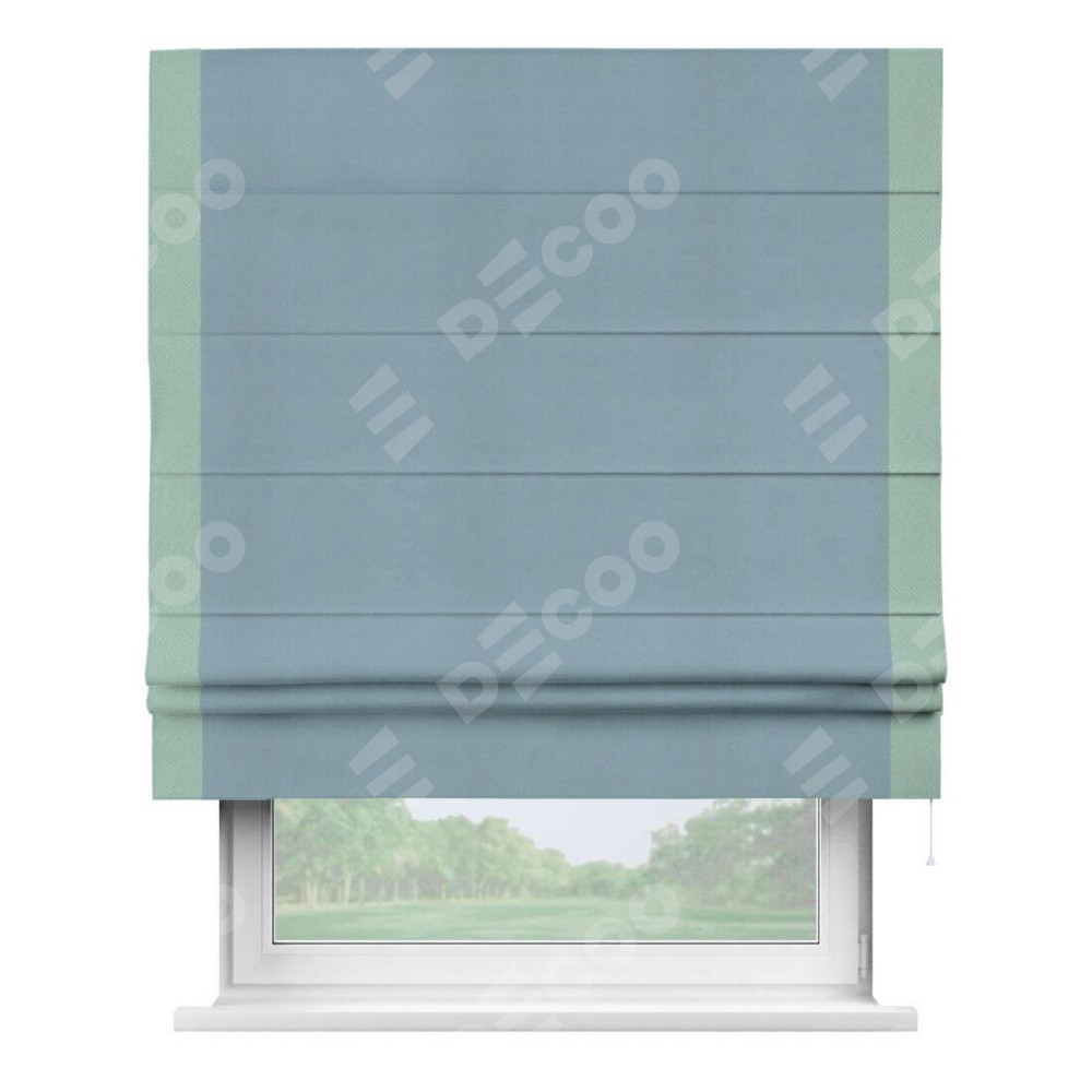 Римская штора производителя «Cortin», используется для проёма, пошита из ткани блэкаут однотонный серо-голубой, артикул ткани 29327−2. Отделка шторы кантом «Стрим Дуо», ткань для канта используется из блэкаута однотонного разной расцветки на выбор. Имеет универсальный механизм и подходит для монтажа: на потолок, на стену и в нишу.