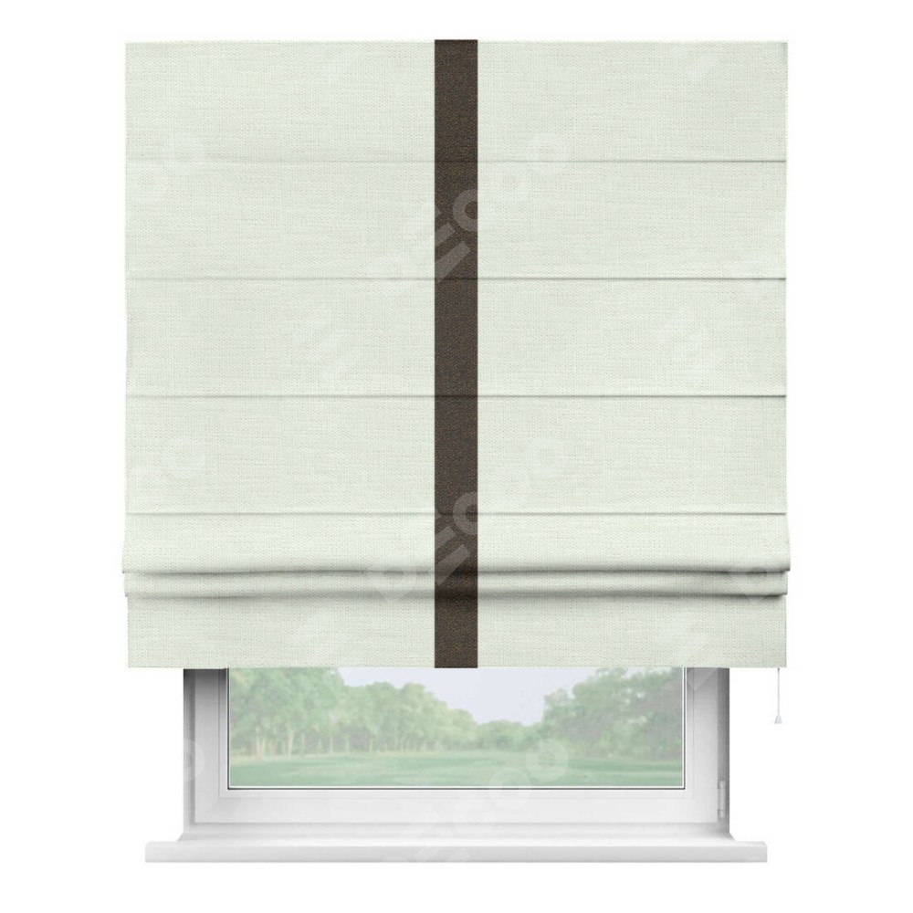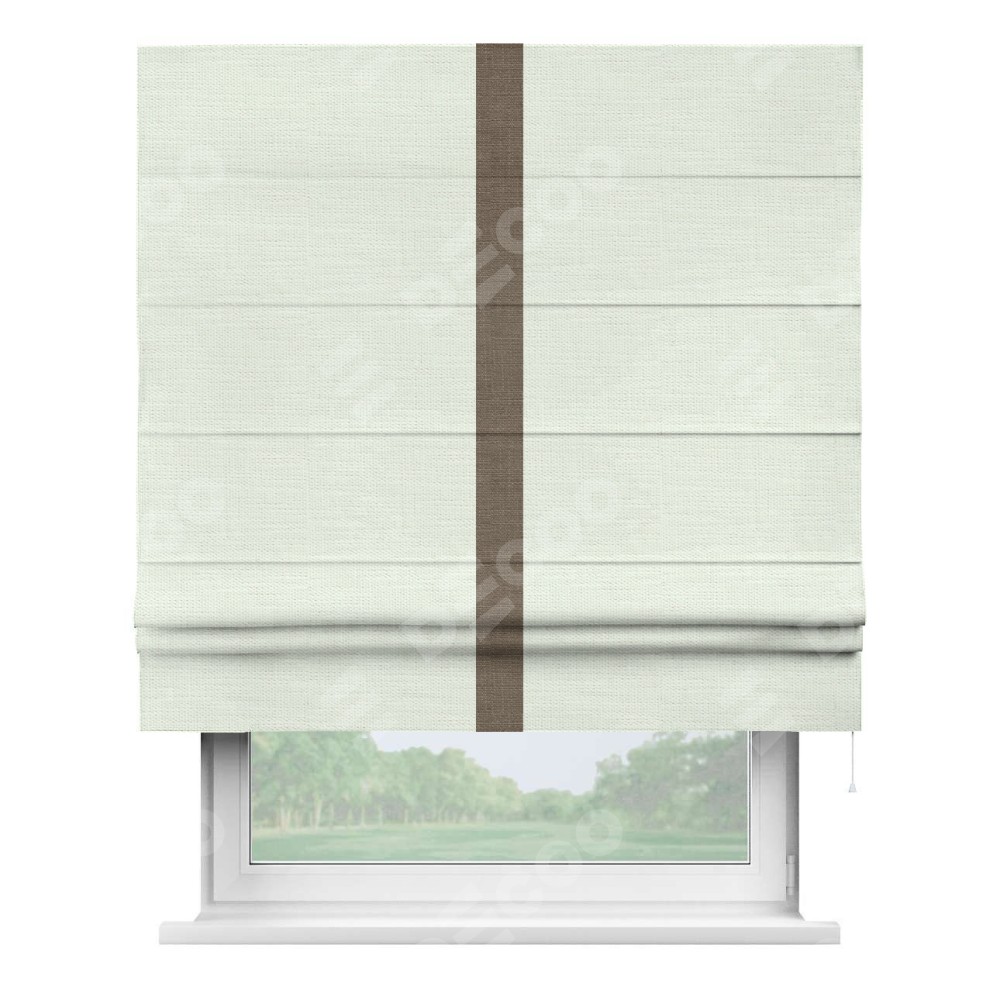 Римская штора производителя «Cortin», используется для проёма, пошита из ткани лён молочный, артикул 23568. Отделка шторы кантом «Хайвэй», ткань для канта используется из льна разной расцветки на выбор. Имеет универсальный механизм и подходит для монтажа: на потолок, на стену и в нишу.