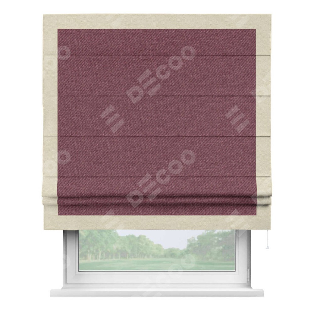 Римская штора производителя «Cortin», используется для проёма, пошита из ткани лён димаут марсала, артикул 1602. Отделка шторы кантом «Чесс», ткань для канта используется из льна димаут разной расцветки на выбор. Имеет универсальный механизм и подходит для монтажа: на потолок, на стену и в нишу.