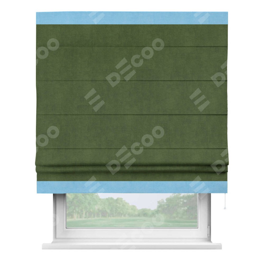 Римская штора производителя «Cortin», используется для проёма, пошита из ткани вельвет тёмно-салатовый, артикул ткани 33805. Отделка шторы кантом «Горизонт», ткань для канта используется из вельвета разной расцветки на выбор. Имеет универсальный механизм и подходит для монтажа: на потолок, на стену и в нишу.