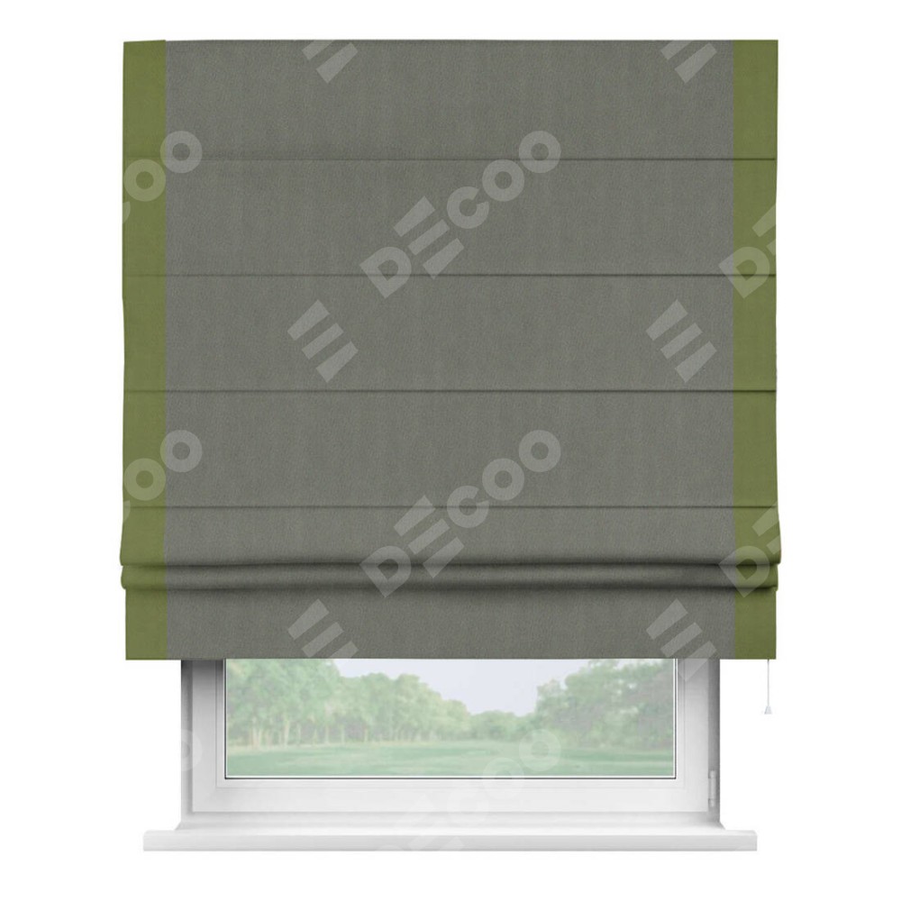 Римская штора производителя «Cortin», используется для проёма, пошита из ткани блэкаут однотонный тёмно-серый, артикул ткани 29332−1. Отделка шторы кантом «Стрим Дуо», ткань для канта используется из блэкаута однотонного разной расцветки на выбор. Имеет универсальный механизм и подходит для монтажа: на потолок, на стену и в нишу.