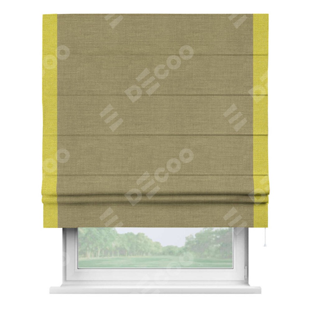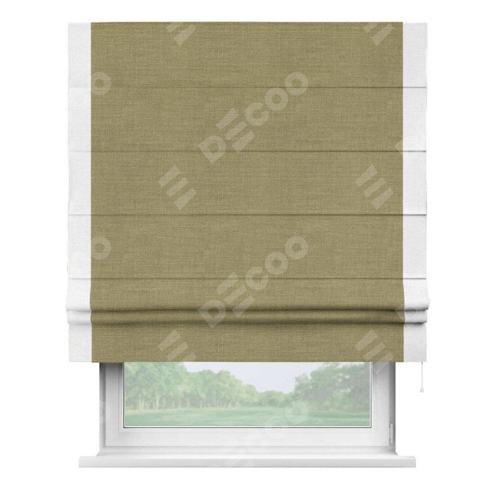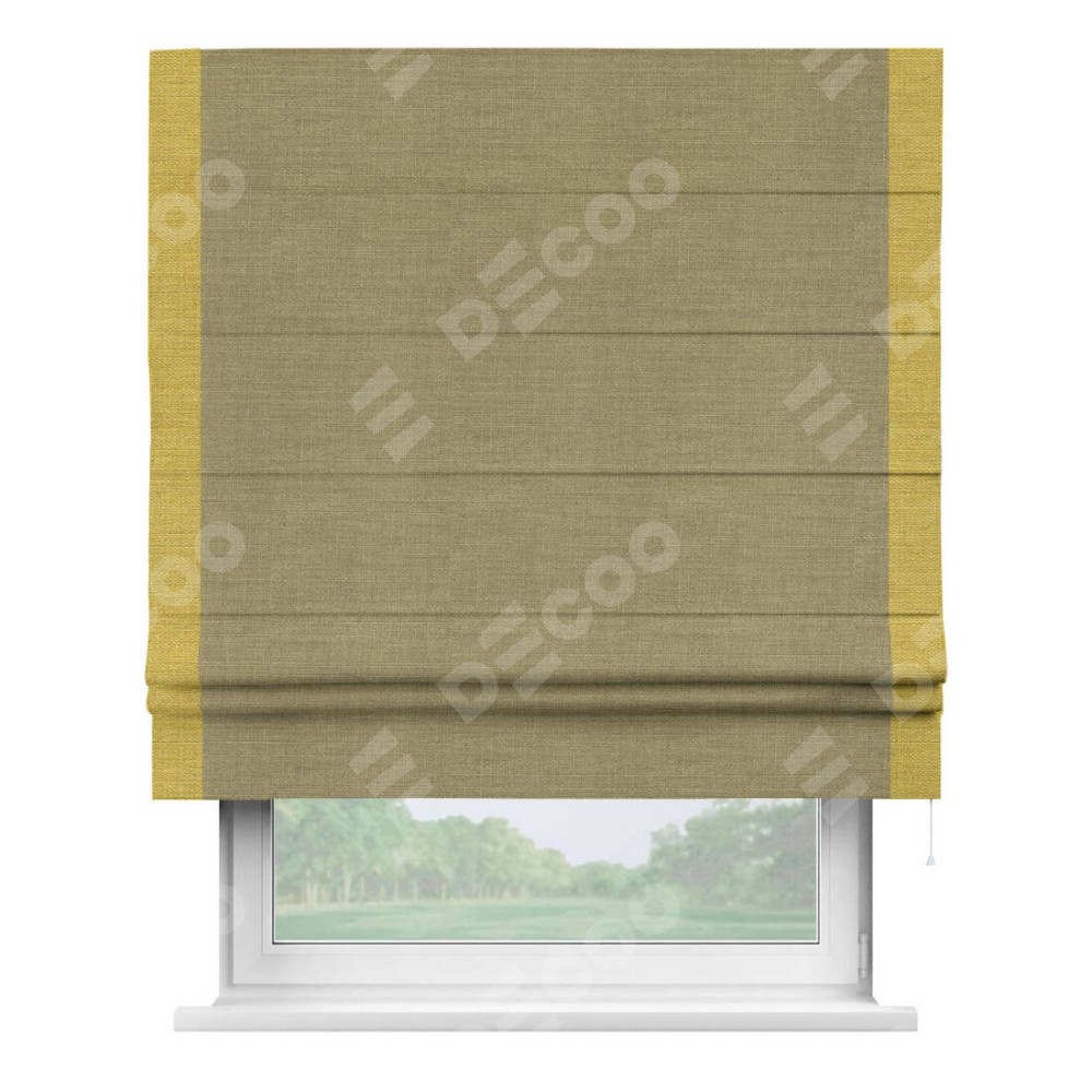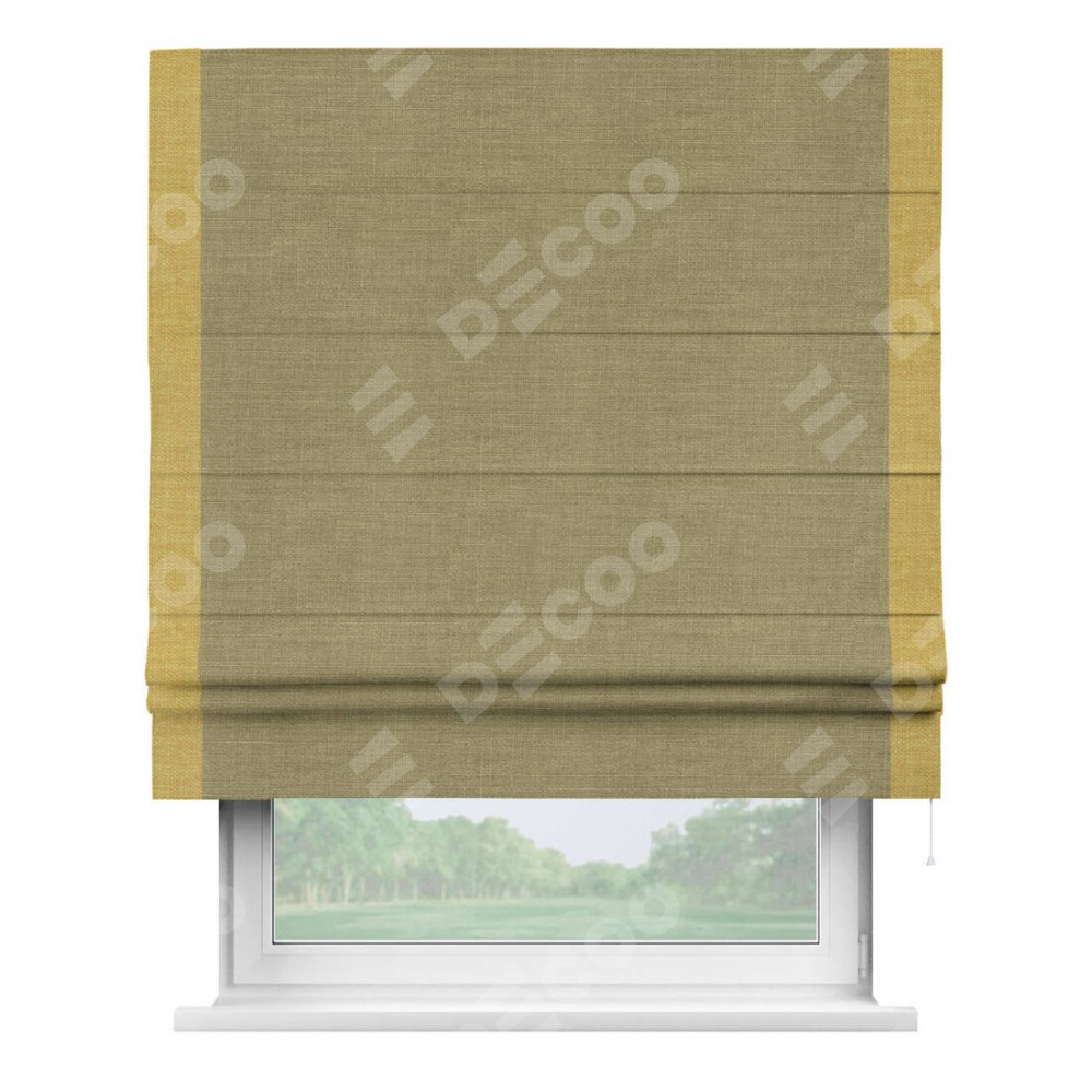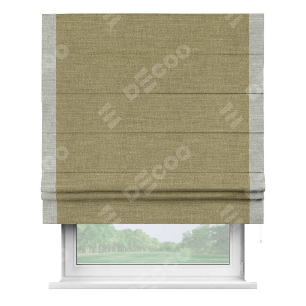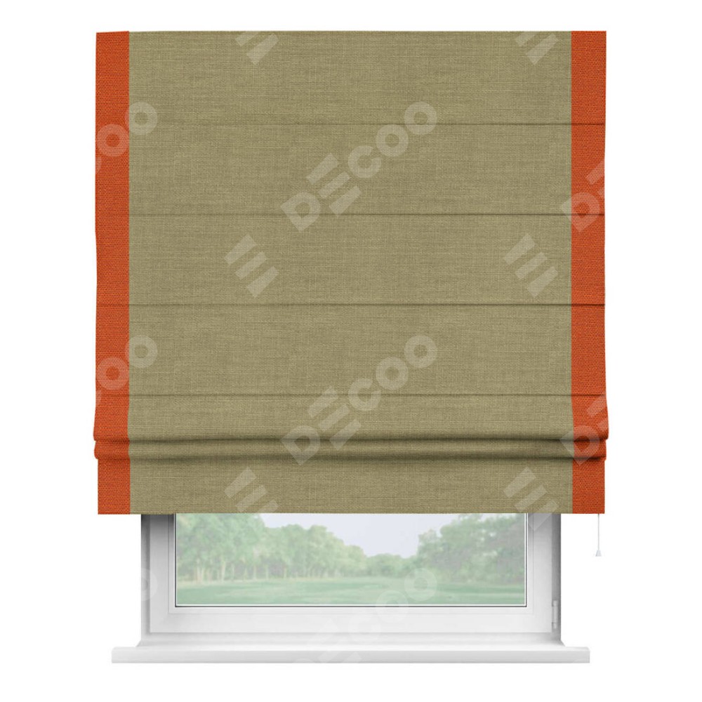 Римская штора производителя «Cortin», используется для проёма, пошита из ткани лён коричневый, артикул 7443. Отделка шторы кантом «Стрим Дуо», ткань для канта используется из льна разной расцветки на выбор. Имеет универсальный механизм и подходит для монтажа: на потолок, на стену и в нишу.