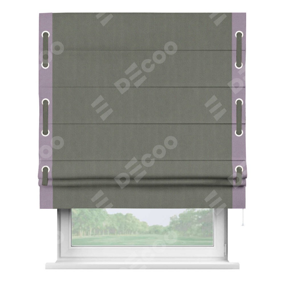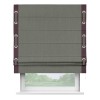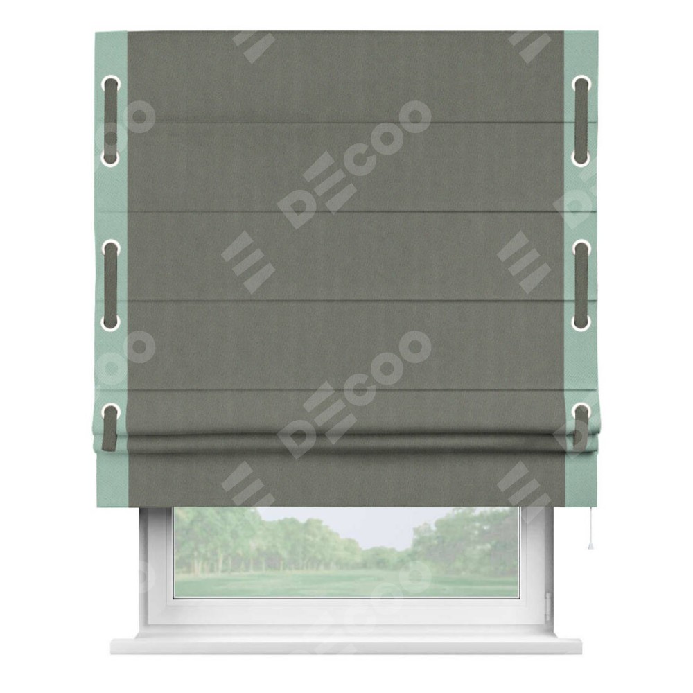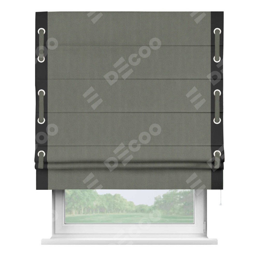 Римская штора производителя «Cortin», используется для проёма, пошита из ткани блэкаут однотонный тёмно-серый, артикул ткани 29332−1. Отделка шторы кантом «Стрим Дуо» на кантах расположены люверсы с пояском, ткань для канта используется из блэкаута однотонного разной расцветки на выбор. Ткань для пояска обычно используется из основной ткани шторы, а так же можно сделать из любой расцветки по желанию. Имеет универсальный механизм и подходит для монтажа: на потолок, на стену и в нишу.