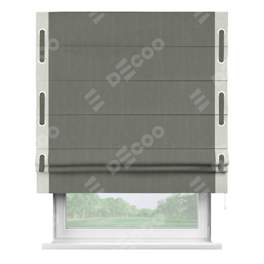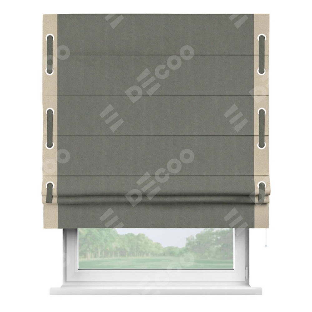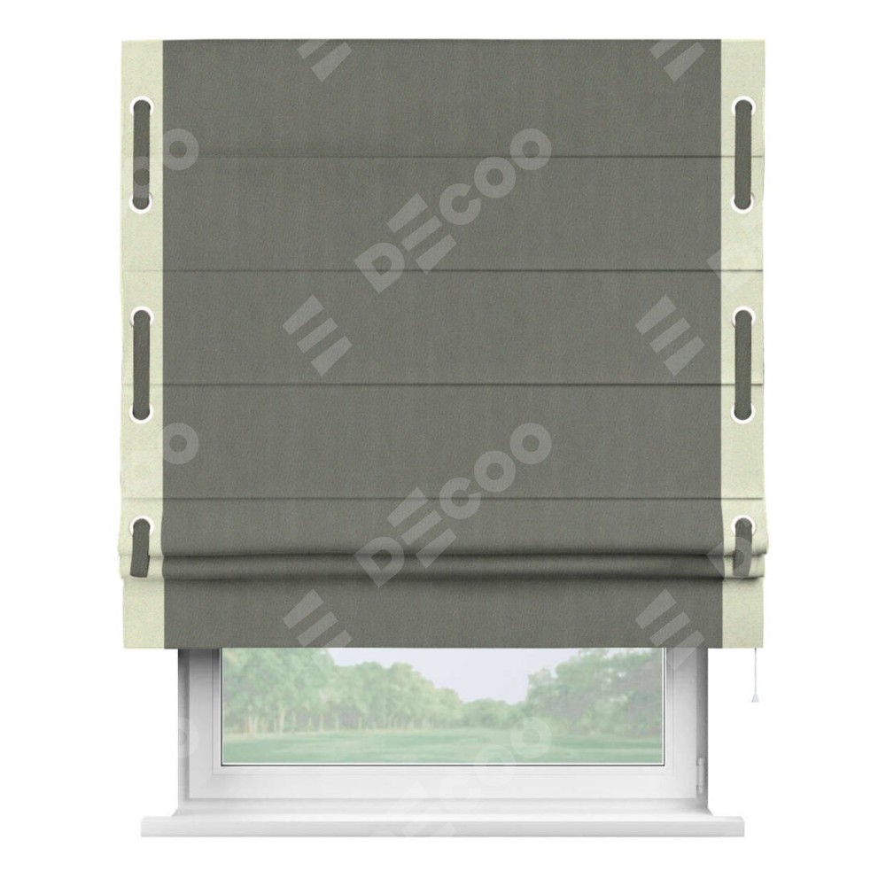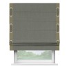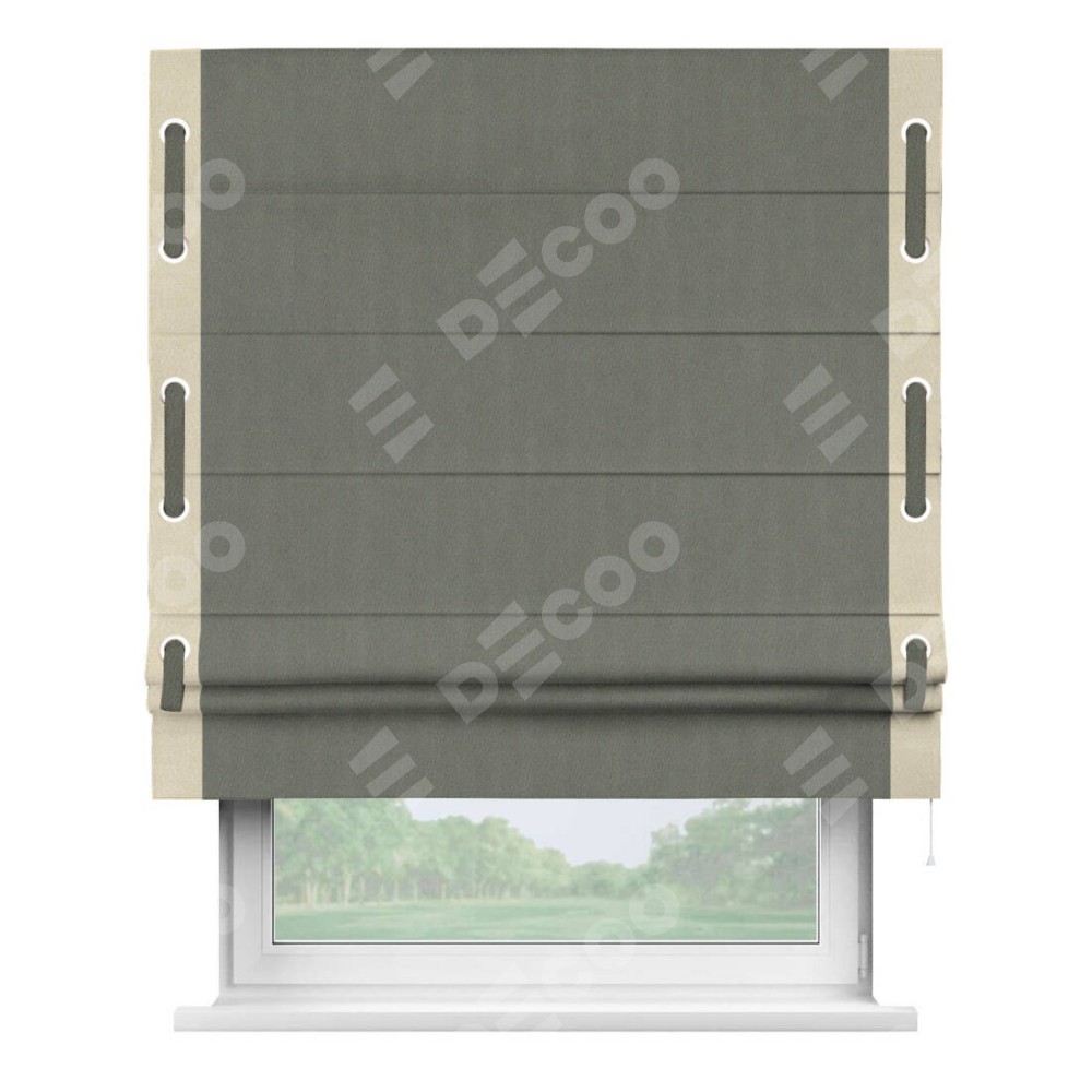 Римская штора производителя «Cortin», используется для проёма, пошита из ткани блэкаут однотонный тёмно-серый, артикул ткани 29332−1. Отделка шторы кантом «Стрим Дуо» на кантах расположены люверсы с пояском, ткань для канта используется из блэкаута однотонного разной расцветки на выбор. Ткань для пояска обычно используется из основной ткани шторы, а так же можно сделать из любой расцветки по желанию. Имеет универсальный механизм и подходит для монтажа: на потолок, на стену и в нишу.
