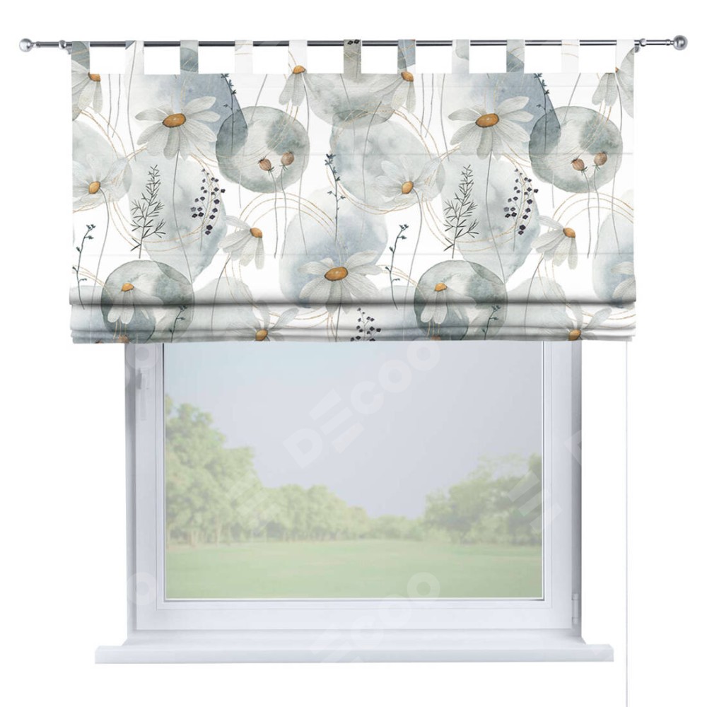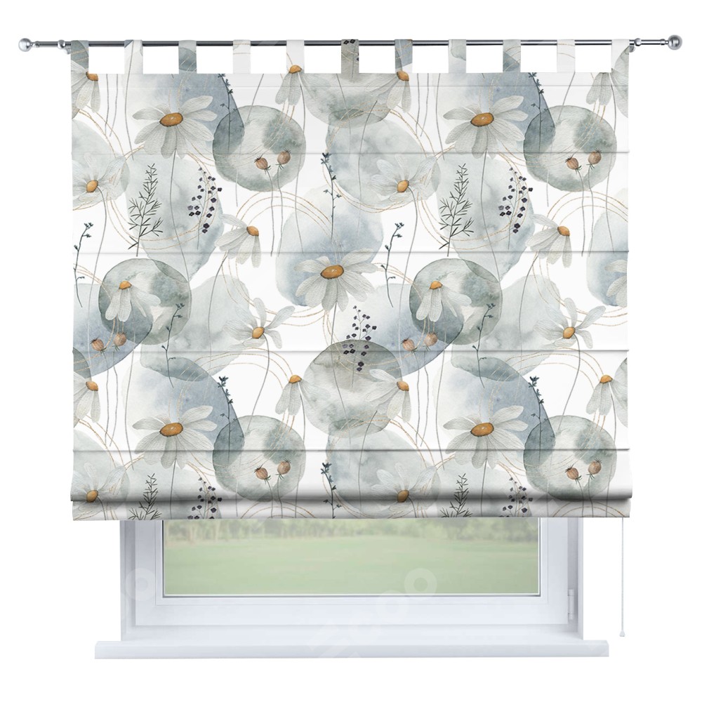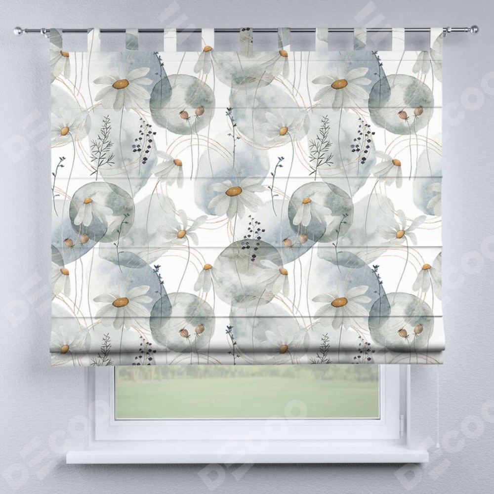 Римская штора производителя «Cortin», используется для проёма, пошита из ткани блэкаут с нанесением сублимационной печати «Ромашки акварель». Данная модель пошита на петлях, комплектуется на выбор круглым карнизом и подходит для монтажа на стену. Римская штора на петлях имеет простую систему регулировки высоты, отличительным преимуществом данной модели является простой способ монтажа. Достаточно повесить ее на трубу и штора готова!